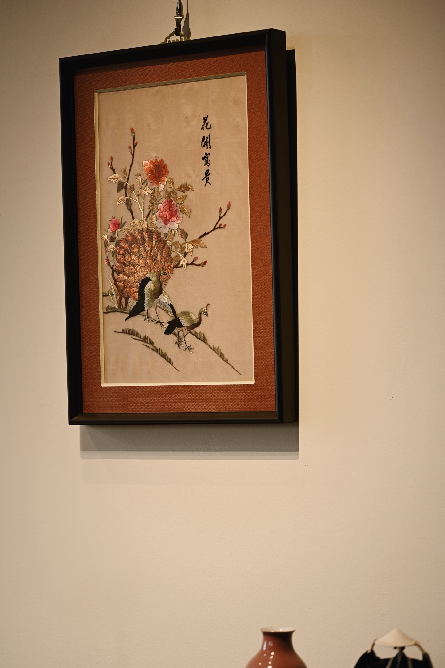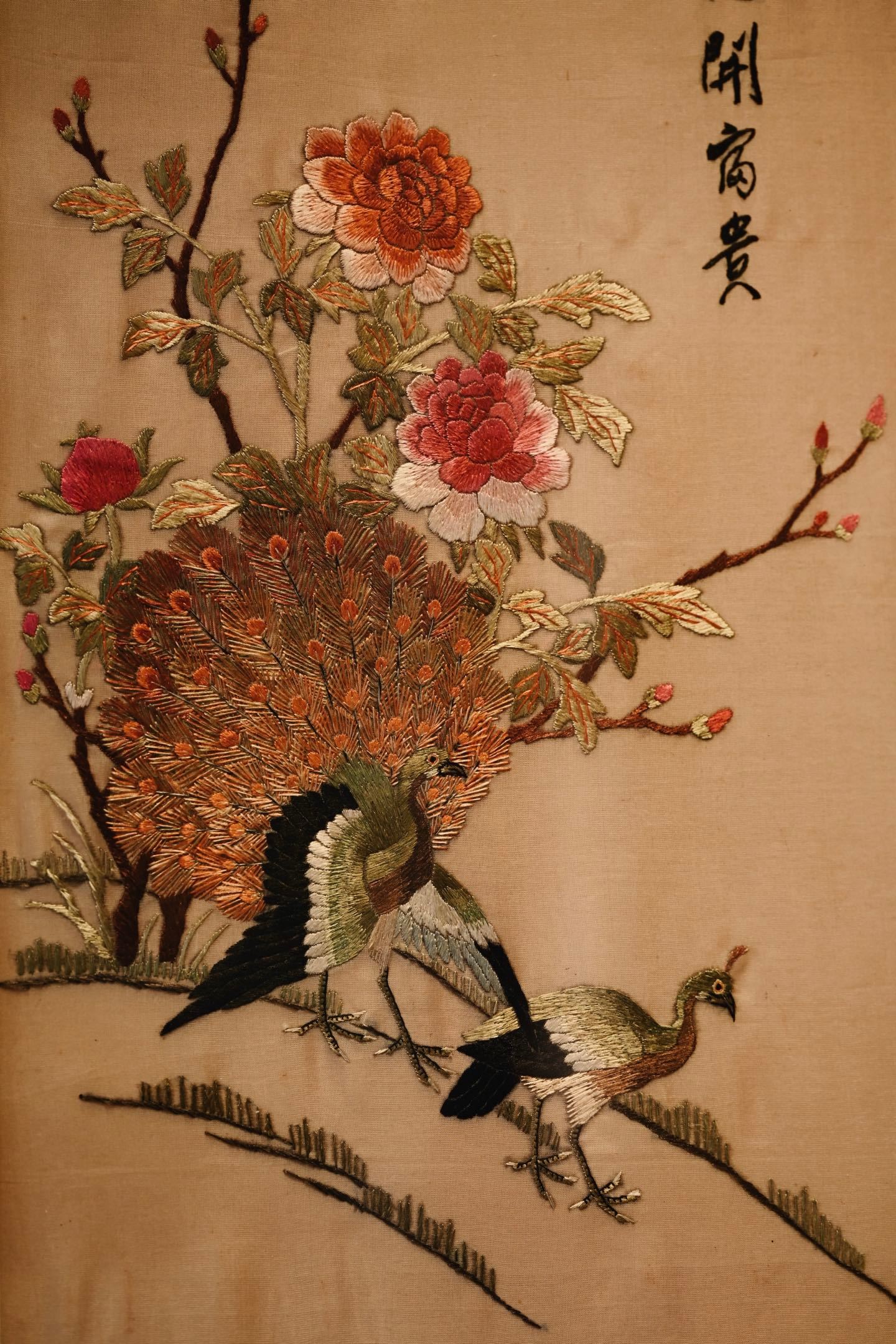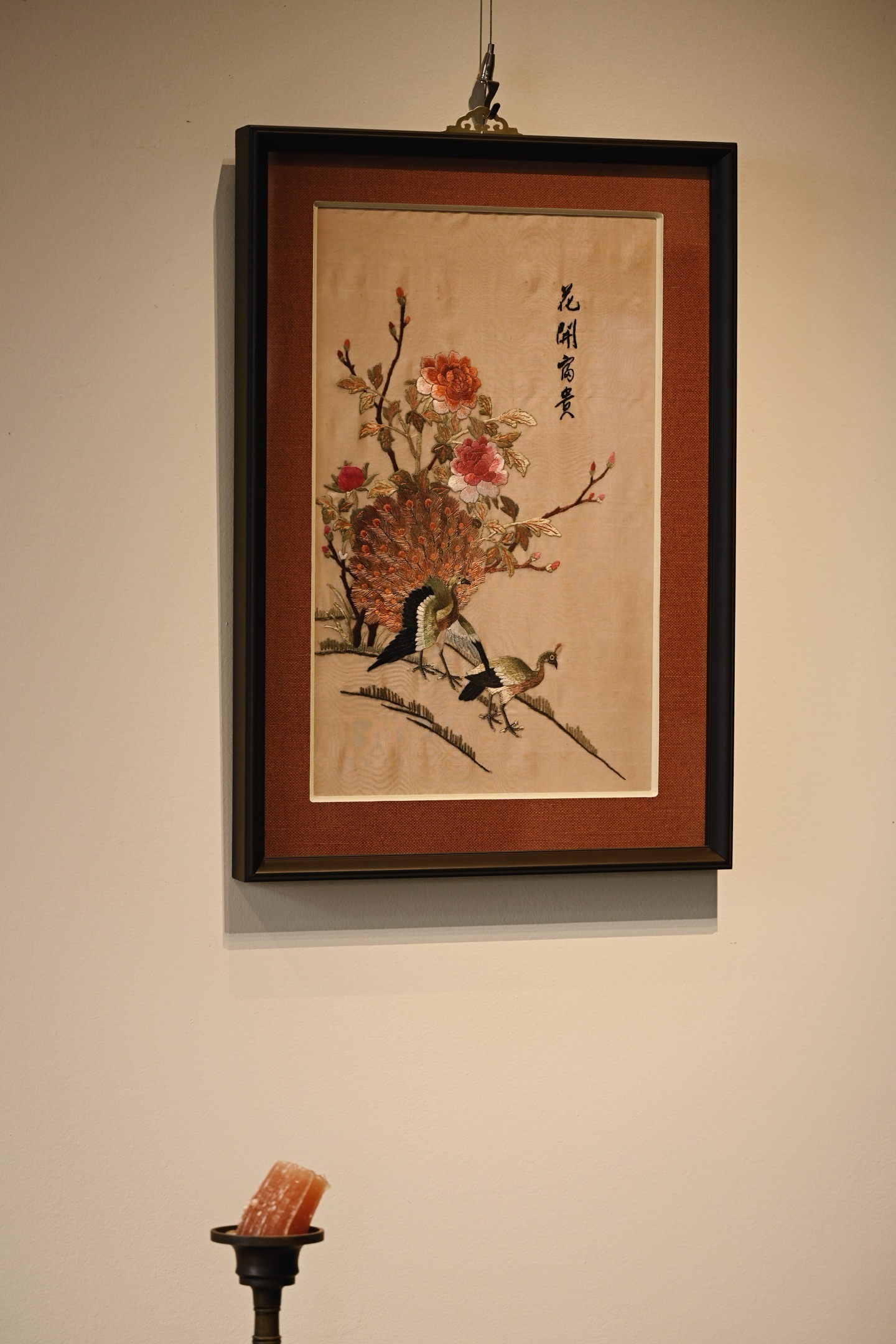 大致民国之物,后裱框,画面中心刺绣孔雀羽毛斑斓华贵,配色丰富,花卉高贵典雅,枝叶精致细腻,悬挂厅堂,古拙吉祥。