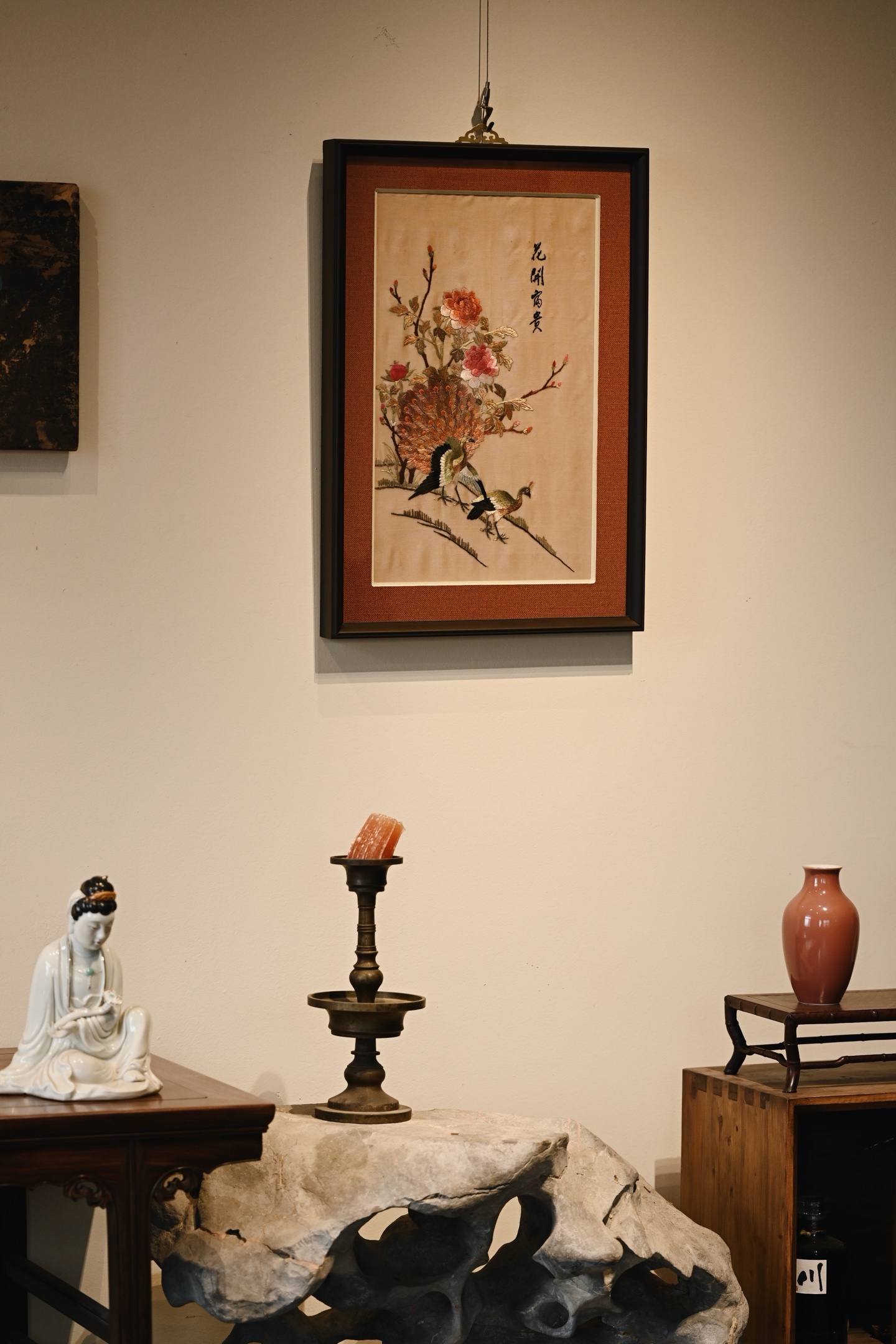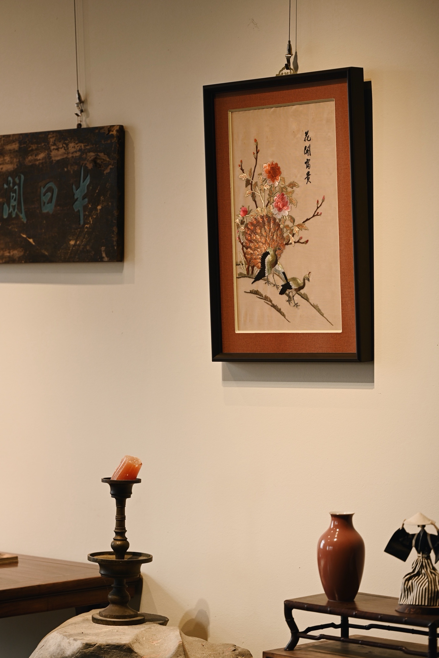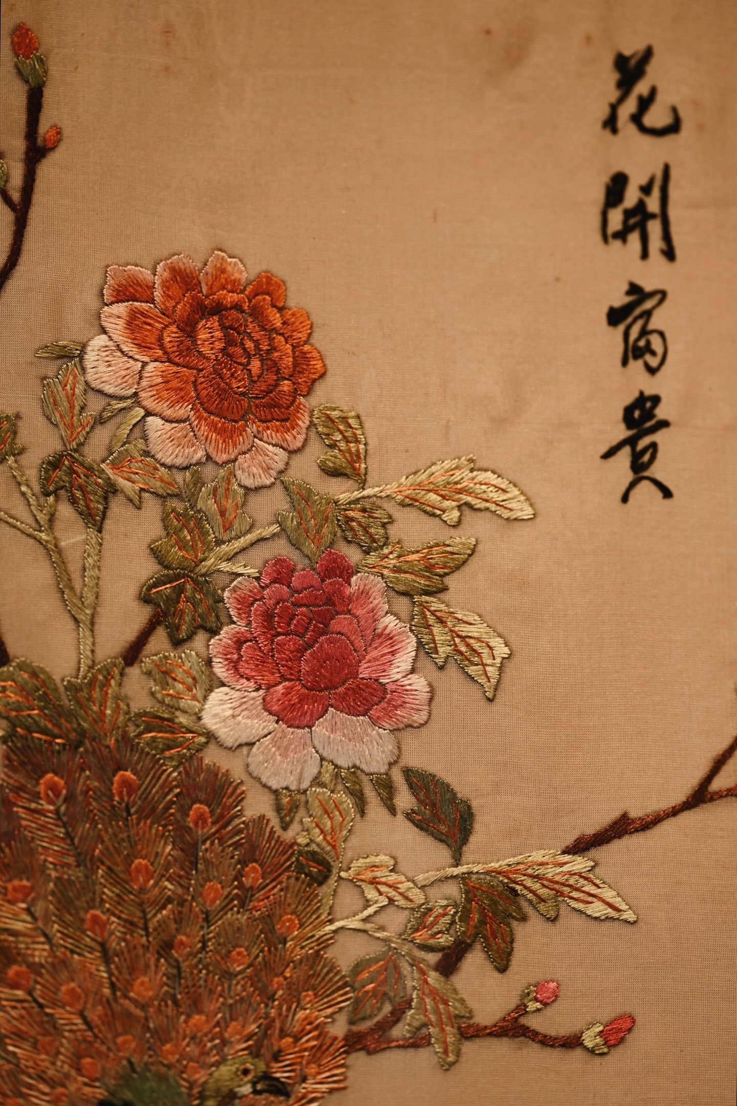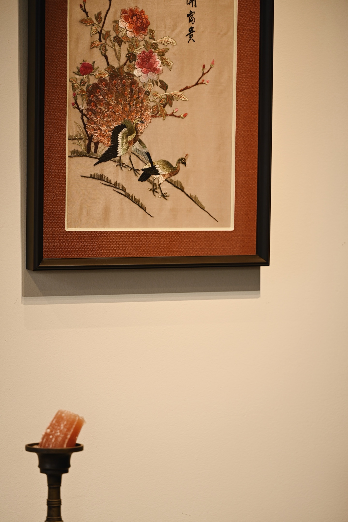 大致民国之物,后裱框,画面中心刺绣孔雀羽毛斑斓华贵,配色丰富,花卉高贵典雅,枝叶精致细腻,悬挂厅堂,古拙吉祥。
