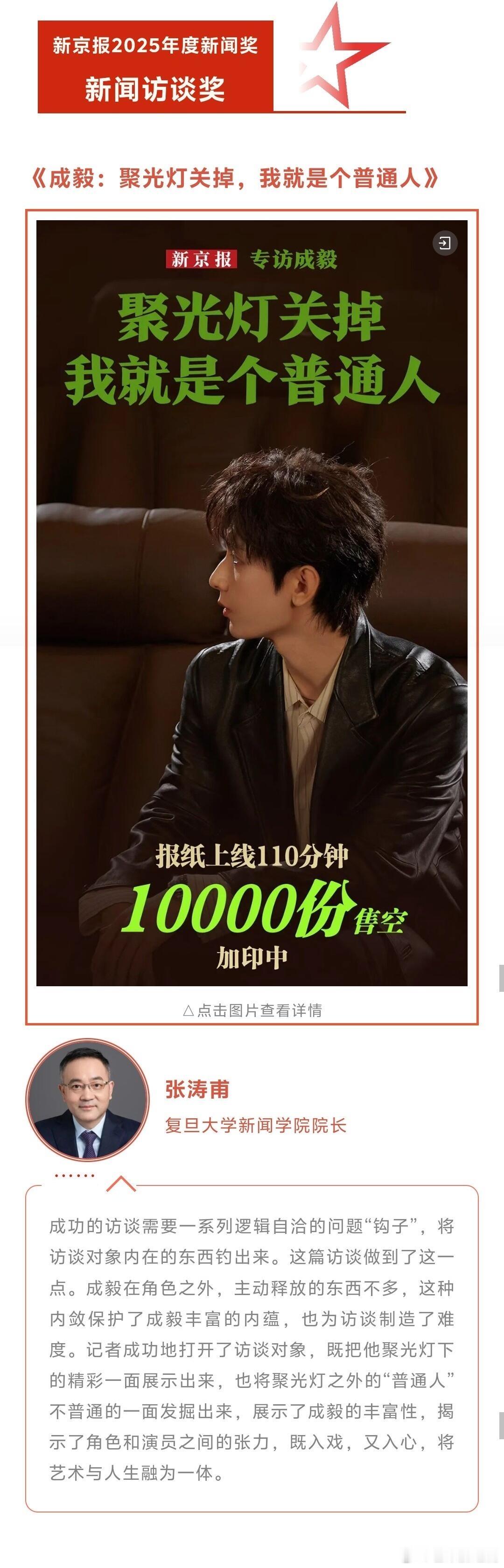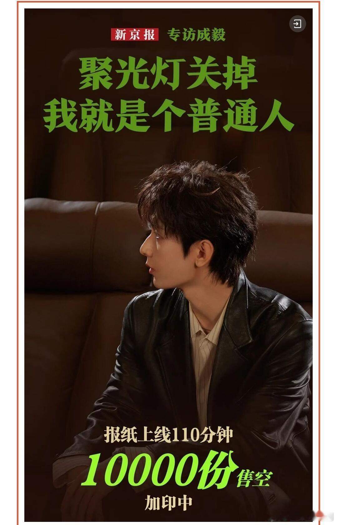 成毅《新京报》专访报纸上线110分钟1万粉售空加印中,访谈粉狂喜~ 言之有物,娓娓道来