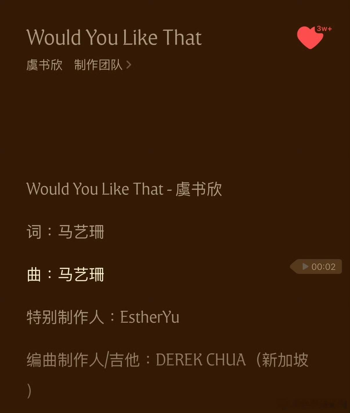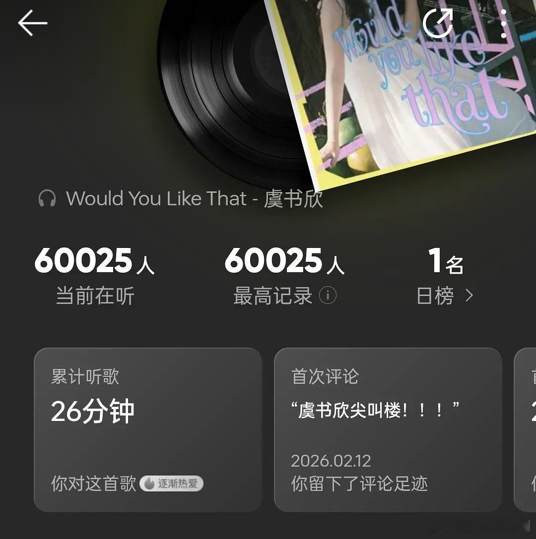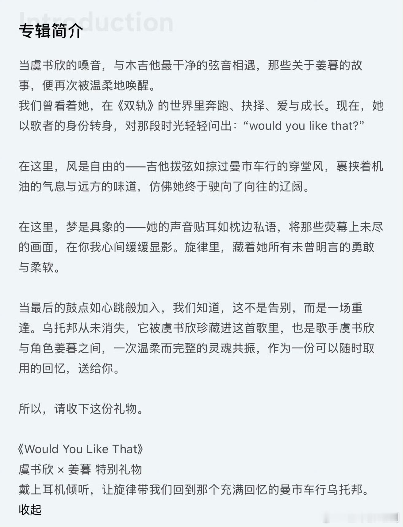 虞书欣以“姜暮”献给大家的特别礼物《Would You Like That》,上线半小时听歌人数就已经破6万,谁懂特别制作人是虞书欣的含金量!