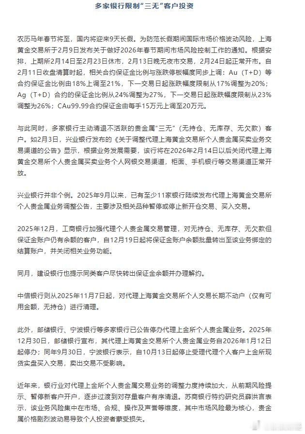 【多家银行清退贵金属三无客户 】黄金 价格剧烈震荡,让金店都吃不消。2月11日截至发稿,现货黄金涨0.34%报5044.7美元/盎司,现货白银日内涨超1%。而此前2月10日,现货金银纷纷收跌。中国黄金自2026年2月7日起,调整贵金属回购业务安排,周六、周日及法定节假日等上海黄金交易所非交易日将暂停办理贵金属回购业务。北京菜市口百货股份有限公司也通过官方微信公众号同步推出类似安排。与此同时,为了避免风险,多家银行对“三无”(无持仓、无库存、无欠款)客户主动进行了清退。(21财经)