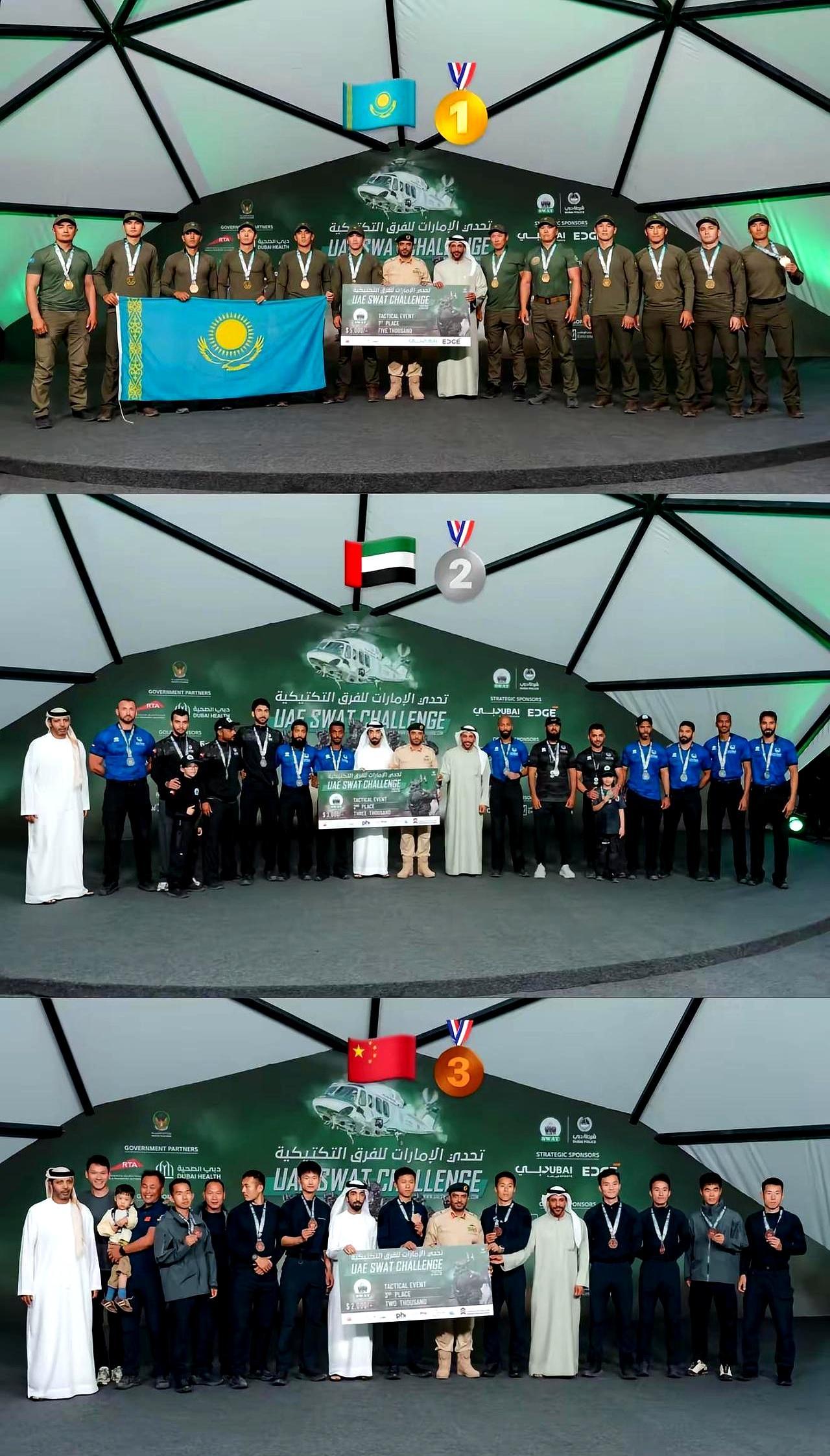 国际特警大赛,前三名被同一国家包揽了。 计时器定格,哈萨克斯坦A队撞线。紧接着,B队、C队接连冲过终点。场边其他国家的队员全愣了,眼睁睁看着领奖台被同一个国旗提前锁定。 这是阿联酋的特警挑战赛,109支队伍,45个国家,真枪实弹的模拟对抗。哈萨克斯坦一下来了五支队伍,连女队都上了。结果不止一个项目屠榜,救援赛前三名直接自己人分完了。最后的总冠军,也被他们的C队稳稳拿下。 你说,这平时得练成什么样?