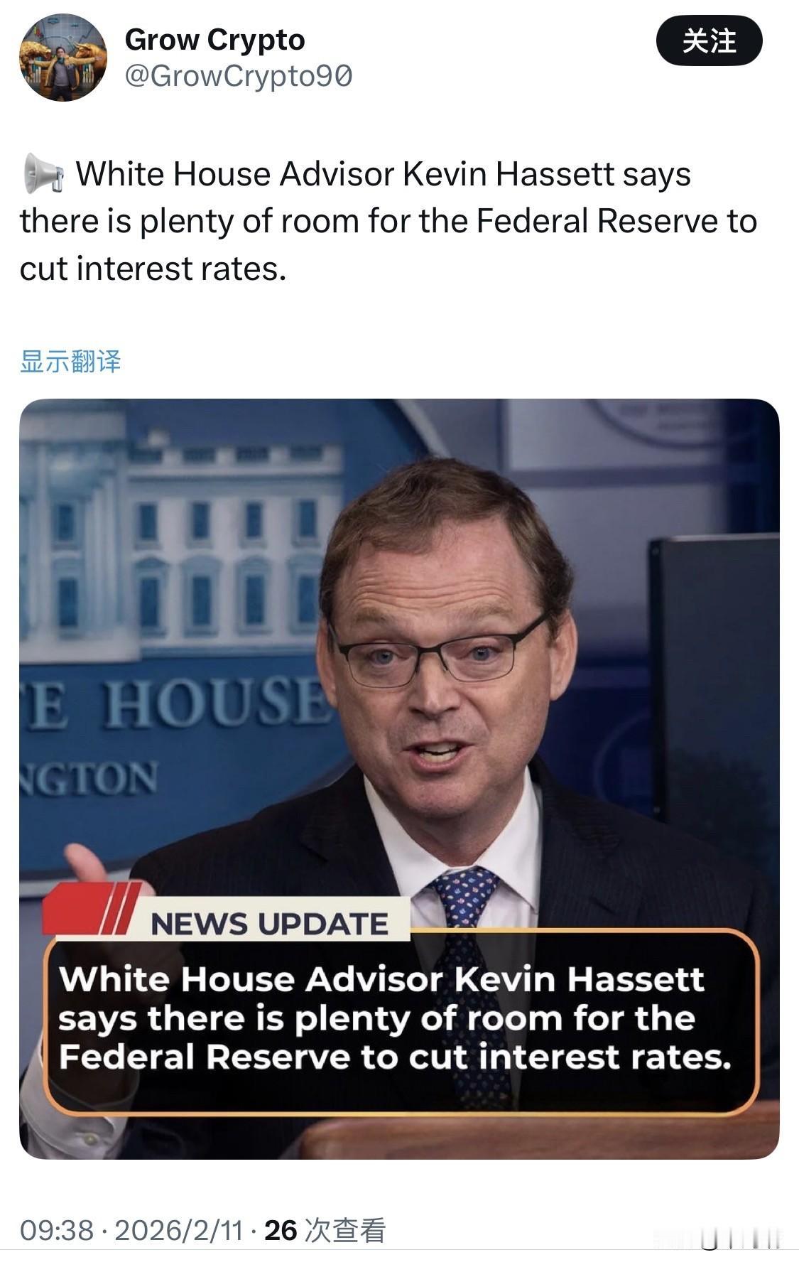 根据 2026 年 2 月 11 日的最新消息,美国白宫国家经济委员会(NEC)主任凯文·哈塞特(Kevin Hassett)在接受福克斯商业新闻网(Fox Business Network)采访时重申,他认为美联储(Fed)仍有“充足的空间”大幅下调基准利率。 核心观点与背景 降息依据:哈塞特指出,人工智能(AI)带来的重大供给侧冲击将推动美国经济高增长且不引发通胀(类似 20 世纪 90 年代的计算机繁荣),这为降息创造了有利条件。 批评现行政策:他认为美联储目前的政策“大幅落后于形势”,并此前暗示如果数据显示允许,降息空间将非常大。 候选主席身份:哈塞特被视为接替杰罗姆·鲍威尔担任下届美联储主席的热门人选之一。他表示若由他执掌美联储,他将依靠独立的经济判断而非政治压力进行决策。 市场现状(截至 2026 年 2 月) 目前,美联储在 2026 年 1 月的议息会议后将联邦基金利率维持在 3.5% - 3.75%。尽管哈塞特呼吁降息,但由于 2026 年 1 月非农就业数据远超预期(新增 13 万个就业岗位),市场普遍预期美联储在短期内(如 3 月会议)仍将保持观望。