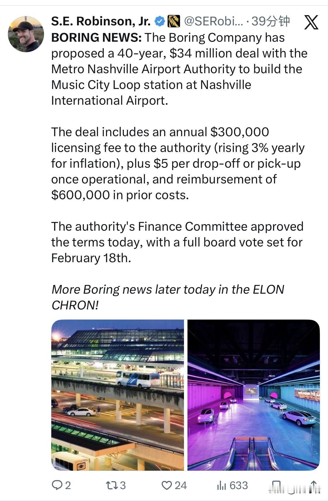 来自马斯克旗下的隧道挖掘公司新闻:该公司又称无聊公司,他们已向田纳西州的纳什维尔都会机场管理局提出一项为期 40 年、价值 3400 万美元的协议,在纳什维尔国际机场建造音乐城环线车站。 该协议包括每年向有关部门支付 30 万美元的许可费(每年因通货膨胀上涨 3%),运营后每次送货或取货收取 5 美元,以及偿还之前 60 万美元的成本。 该机构的财务委员会今天批准了这些条款,全体董事会将于 2 月 18 日进行投票表决。