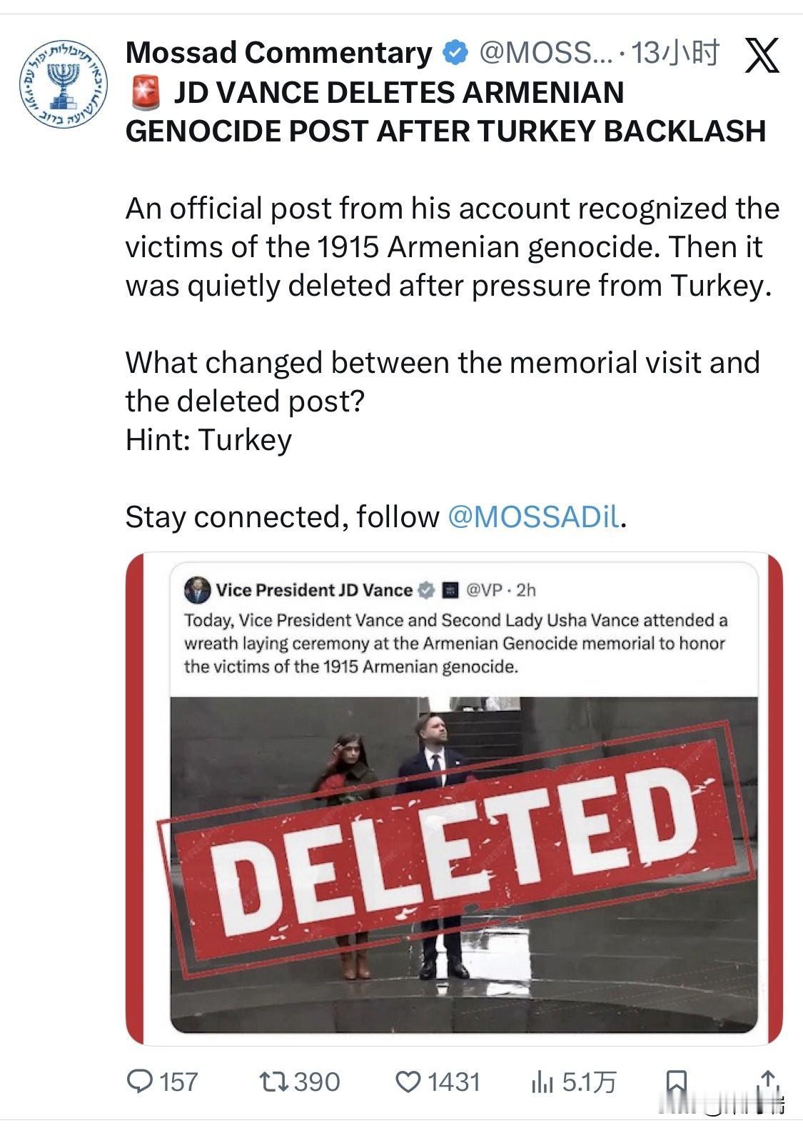 美国副总统万斯在土耳其舆论反弹后删除了有关亚美尼亚种族灭绝的帖子 他的官方账号曾发布一条帖子,承认1915年亚美尼亚种族灭绝的受害者。之后,在土耳其的压力下,该帖子被悄悄删除。 从悼念活动到删除帖子之间发生了什么变化?