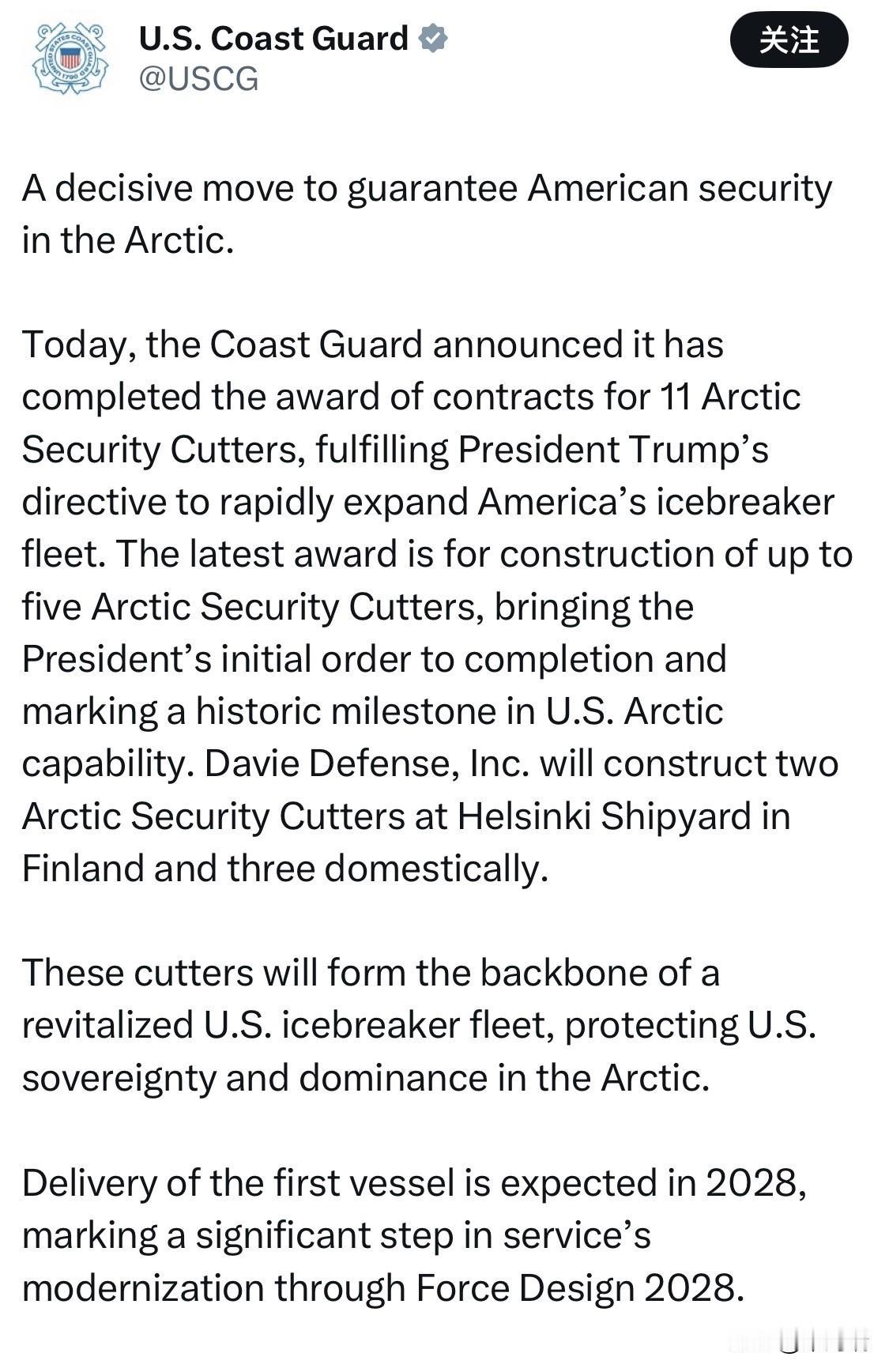 为保障美国在北极地区的安全而采取的决定性举措。 今天,美国海岸警卫队宣布已完成11艘北极安全巡逻舰的合同授予工作,落实了特朗普总统迅速扩充美国破冰船队的指示。最新授予的合同涉及建造至多5艘北极安全巡逻舰,标志着总统最初的订单已全部完成,也标志着美国北极能力发展的一个历史性里程碑。戴维防务公司(Davie Defense, Inc.)将在芬兰赫尔辛基造船厂建造两艘北极安全巡逻舰,其余三艘将在美国本土建造。 这些破冰船将成为重振美国破冰船队的中坚力量,保护美国在北极的主权和主导地位。 首艘舰艇预计将于 2028 年交付,这标志着通过“部队设计 2028”计划实现军队现代化迈出了重要一步。