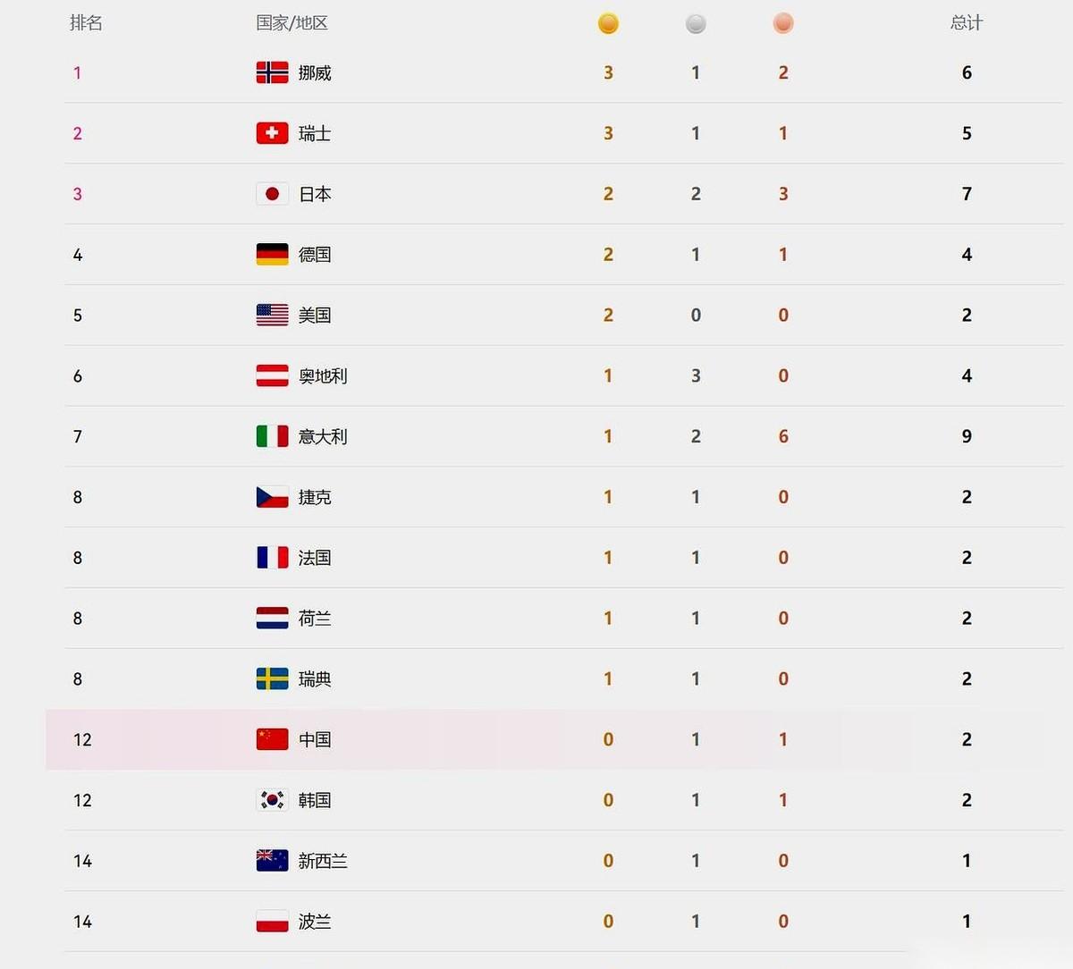 一张2月10号的冬奥奖牌榜,就那么静静地挂着。 榜首,挪威,3块金牌,不多不少,像个老猎人,稳坐在雪山顶上,俯瞰着下面的一切。 瑞士紧随其后,同样3金,但少了一块铜牌,气息稍弱了一点。 往下扫,日本的数字最热闹,哗啦啦7块奖牌,可金牌只有2块。意大利更是夸张,9块奖牌铺了一地,金的却只有一个。 有人不玩人海战术。美国,出手两次,就是两块金牌,干净利落。 镜头一路滑下来,滑过一串串国旗,终于,在第12名的位置上定格——这里,一面红旗,旁边跟着两个刺眼的数字:0金,1银,1铜。 那块银牌,是谷爱凌在雪道上划出的银光。 那块铜牌,是苏翊鸣在空中翻转后稳稳落地的重量。 这不叫落后,这叫大戏的序幕才刚刚拉开。