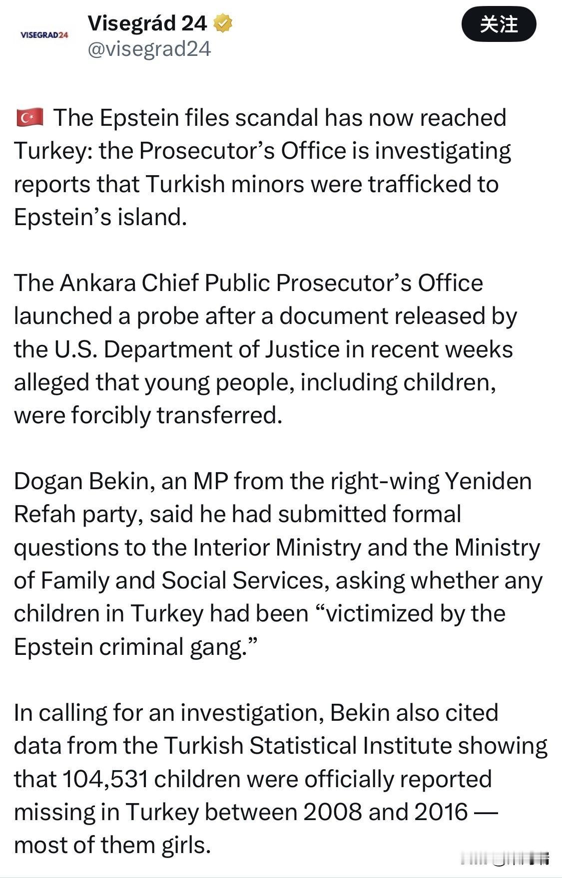 爱泼斯坦丑闻如今已蔓延至土耳其:检察官办公室正在调查有关土耳其未成年人被贩卖到爱泼斯坦岛屿的报道。 安卡拉首席检察官办公室在最近几周美国司法部公布的一份文件指控包括儿童在内的年轻人被强行转移后,展开了调查。 来自右翼政党“新曙光党”的议员多安·贝金表示,他已向内政部和家庭与社会服务部提交正式质询,询问土耳其是否有儿童“受到爱泼斯坦犯罪团伙的侵害”。 贝金在呼吁进行调查时,还引用了土耳其统计局的数据,数据显示,2008 年至 2016 年间,土耳其官方报告失踪儿童人数为 104,531 人,其中大部分是女孩。