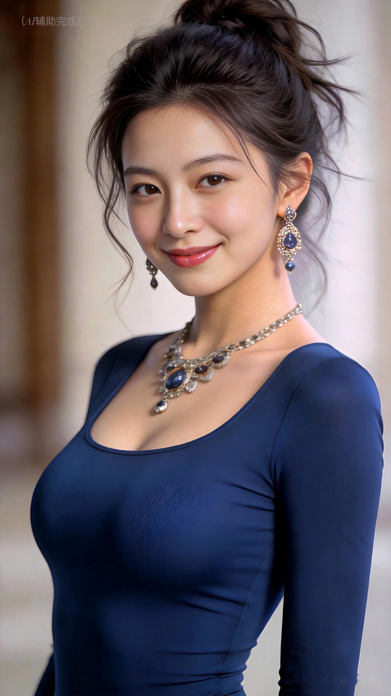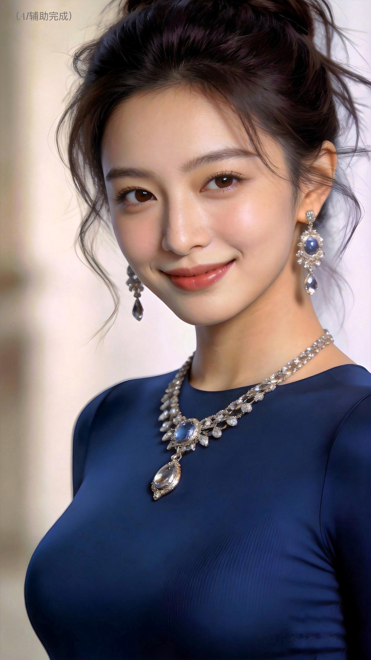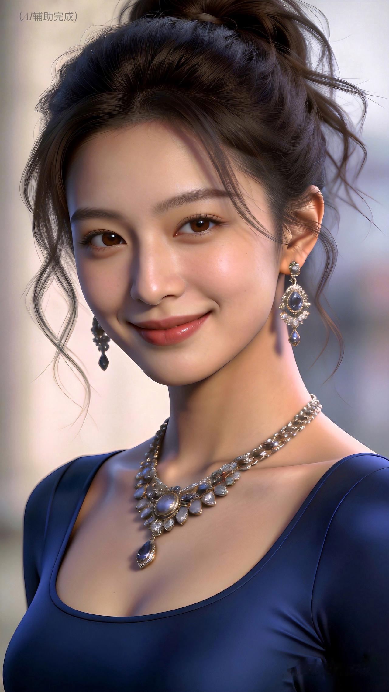 高挽发髻碎发扬,深蓝华服裹雅姿。蓝宝钻石链耳耀,眉眼含笑眸亮柔。虚化朦胧衬仙韵,