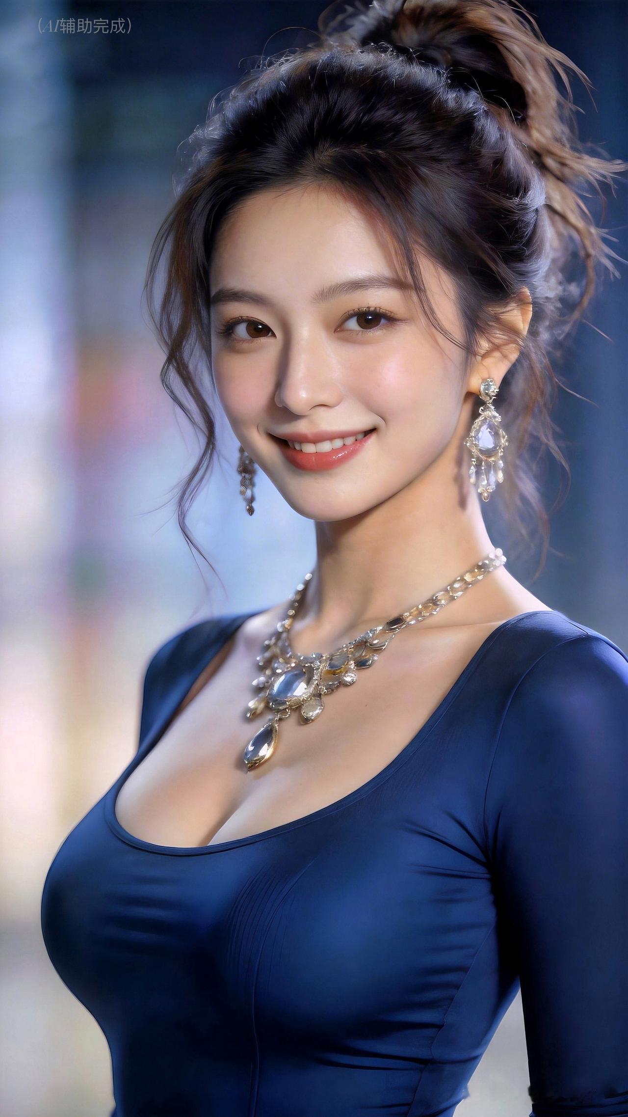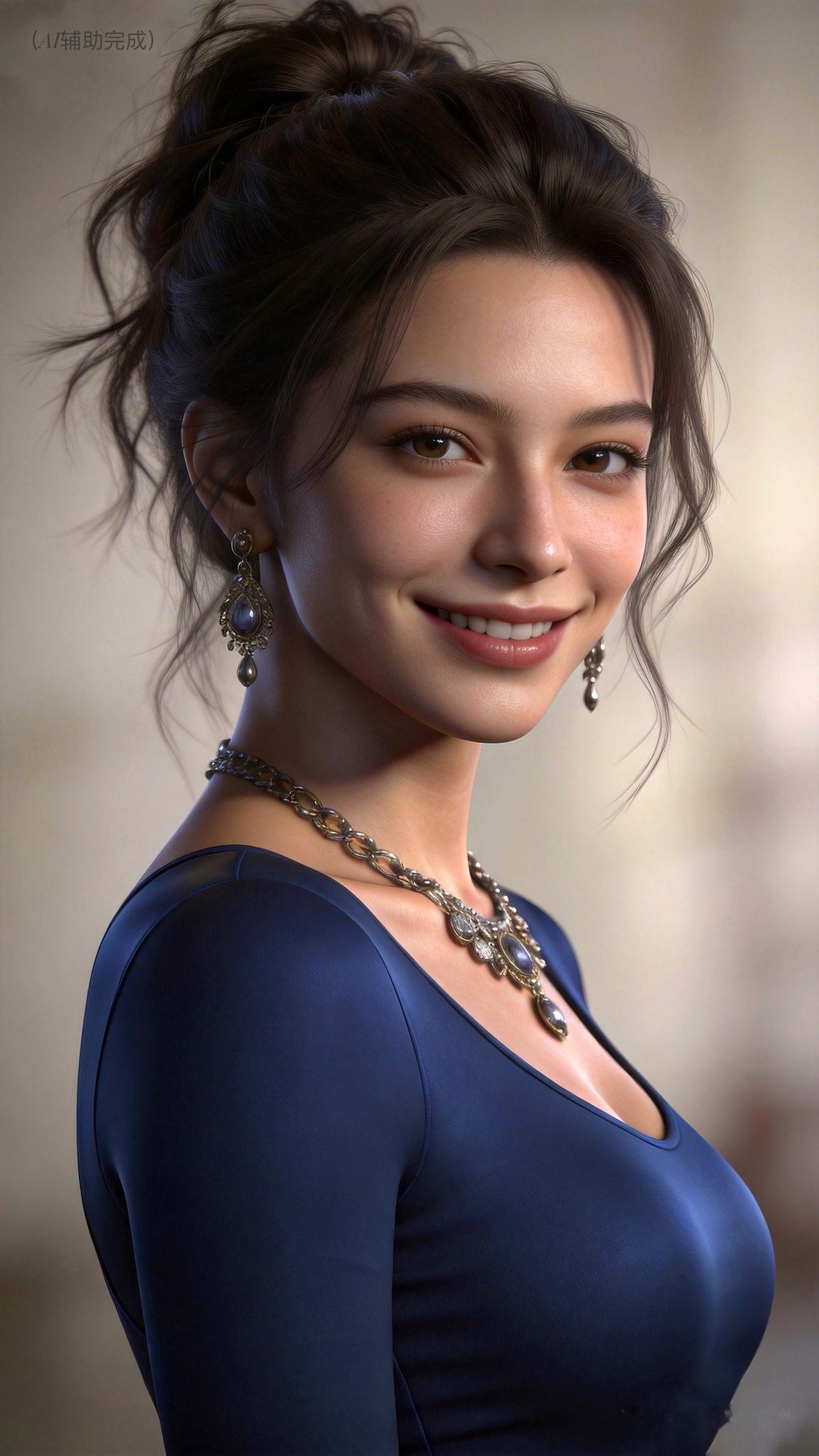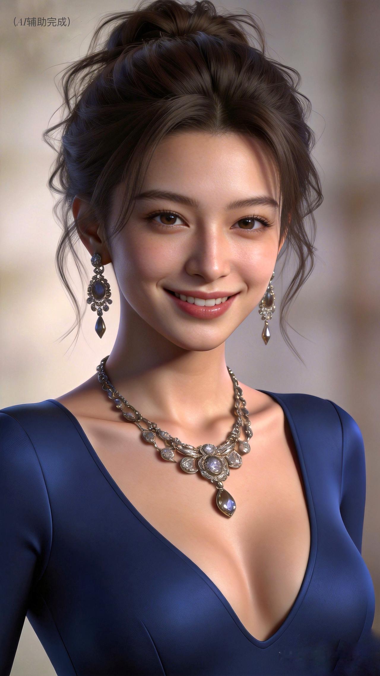 高挽发髻碎发扬,深蓝华服裹雅姿。蓝宝钻石链耳耀,眉眼含笑眸亮柔。虚化朦胧衬仙韵,