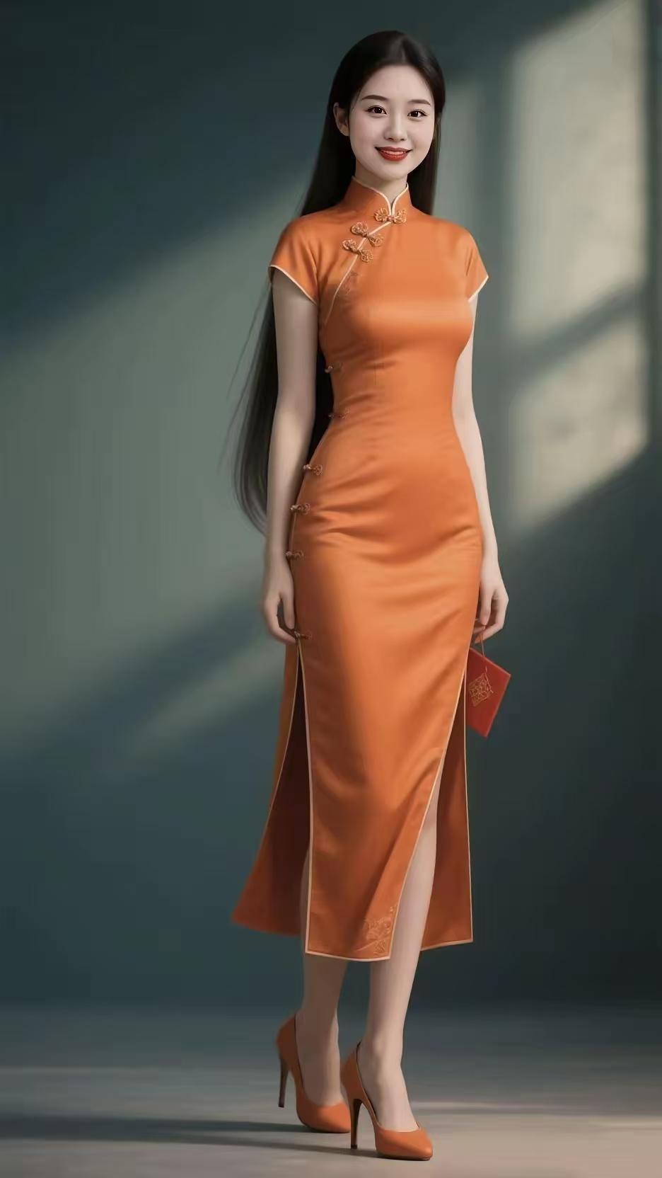 忆秦娥·橙袍佳人 霞天映, 橙衫袅袅仙姿靓。 仙姿靓, 盘扣精巧, 襟边情荡。 莲足轻步香尘漾, 丹唇微绽诗韵酿。 诗韵酿, 旗袍逸态, 众心波涨。