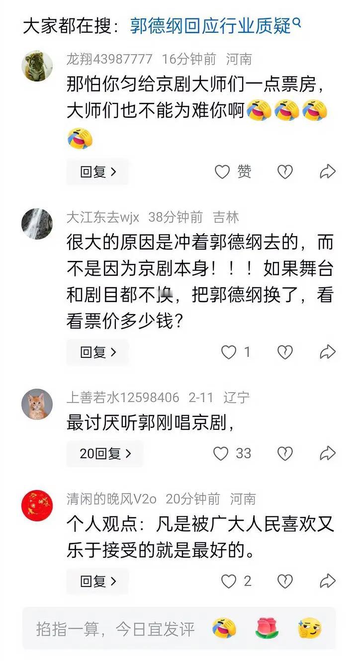 2月11日,郭德纲突然冲上了热搜,这次他不再客气,直接硬刚:“我用的都是八十年前京剧舞台上用剩下的东西,不是创新是复古”,一句话把争议拉到了新高度。 好多人说,郭德纲在创新京剧,或者说郭德纲在糟改京剧,台上用了好多相声东西,我只能说是你没见过。…” ​我是啥戏都不懂的普通人,以前京剧听都不听,要不是郭德纲在相声里唱两段,我这辈子都不会碰。 有人说他不专业、乱改、唱腔不对,可你们唱得再“正宗”,台下空落落,年轻人不买账。 老郭一演,票价1280秒空,黄牛炒到3000,大把年轻人举着荧光棒听戏,把快没人看的老戏给盘活了。 专业不专业咱不懂,有人看、能流传,才是真本事。