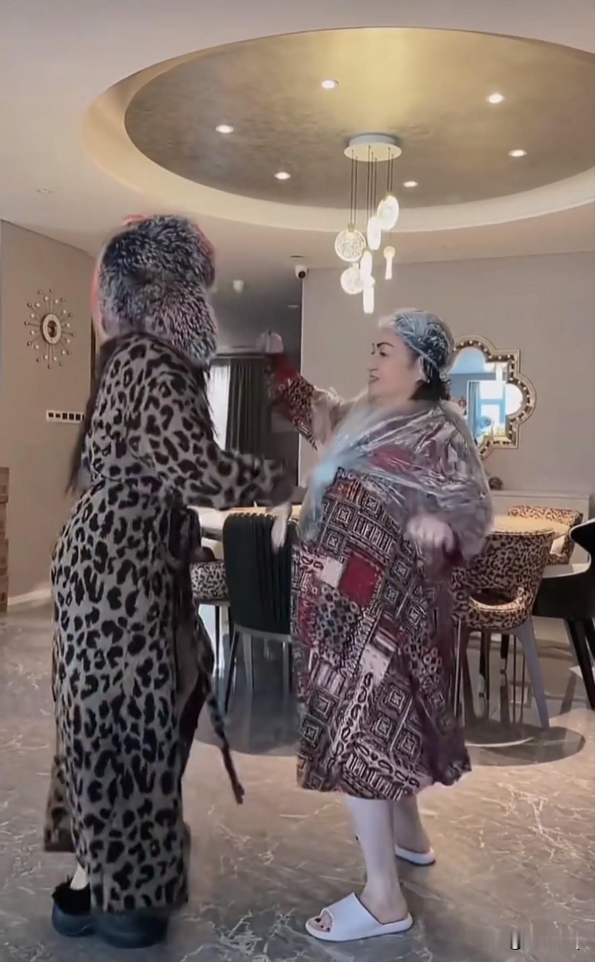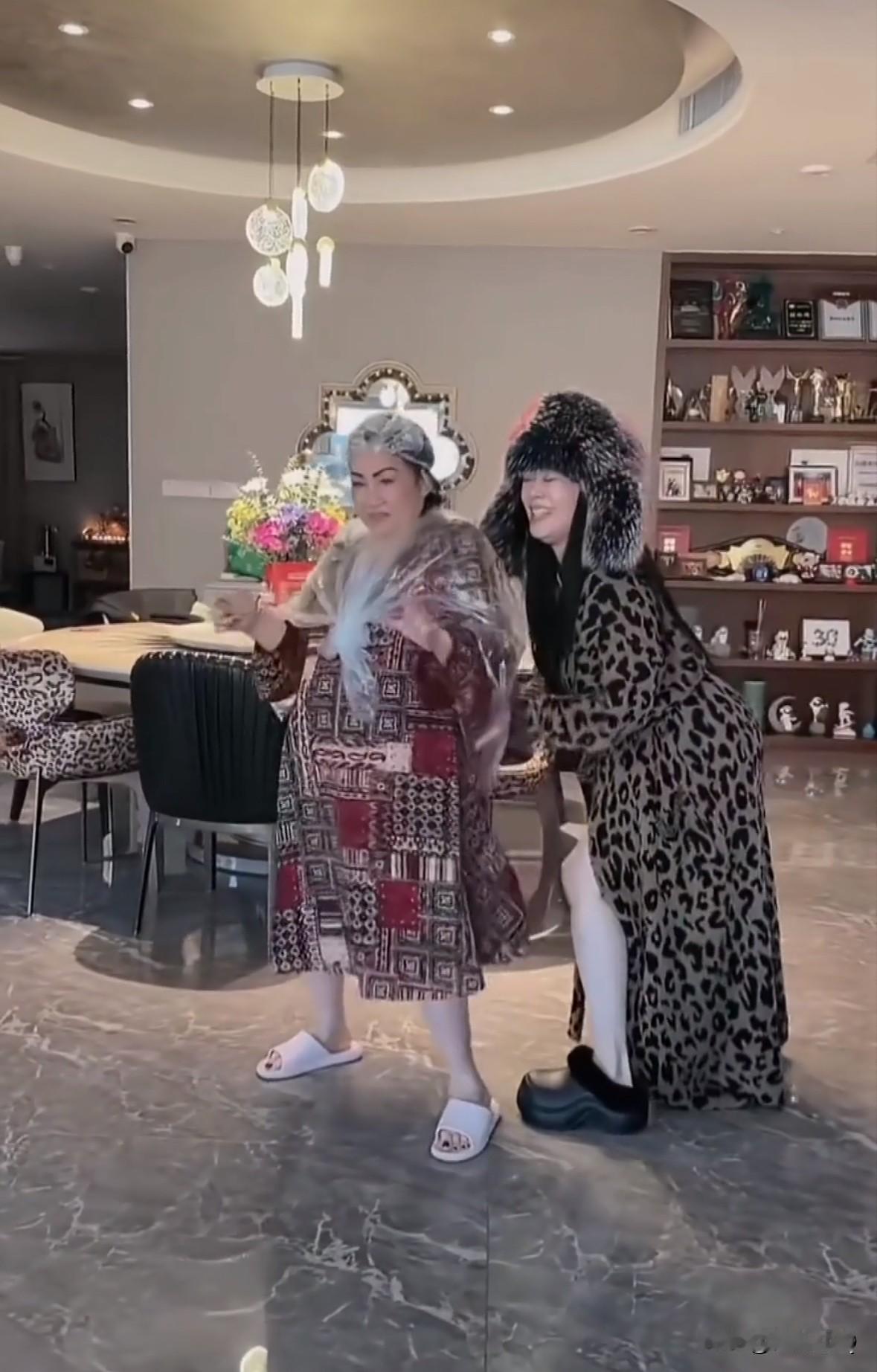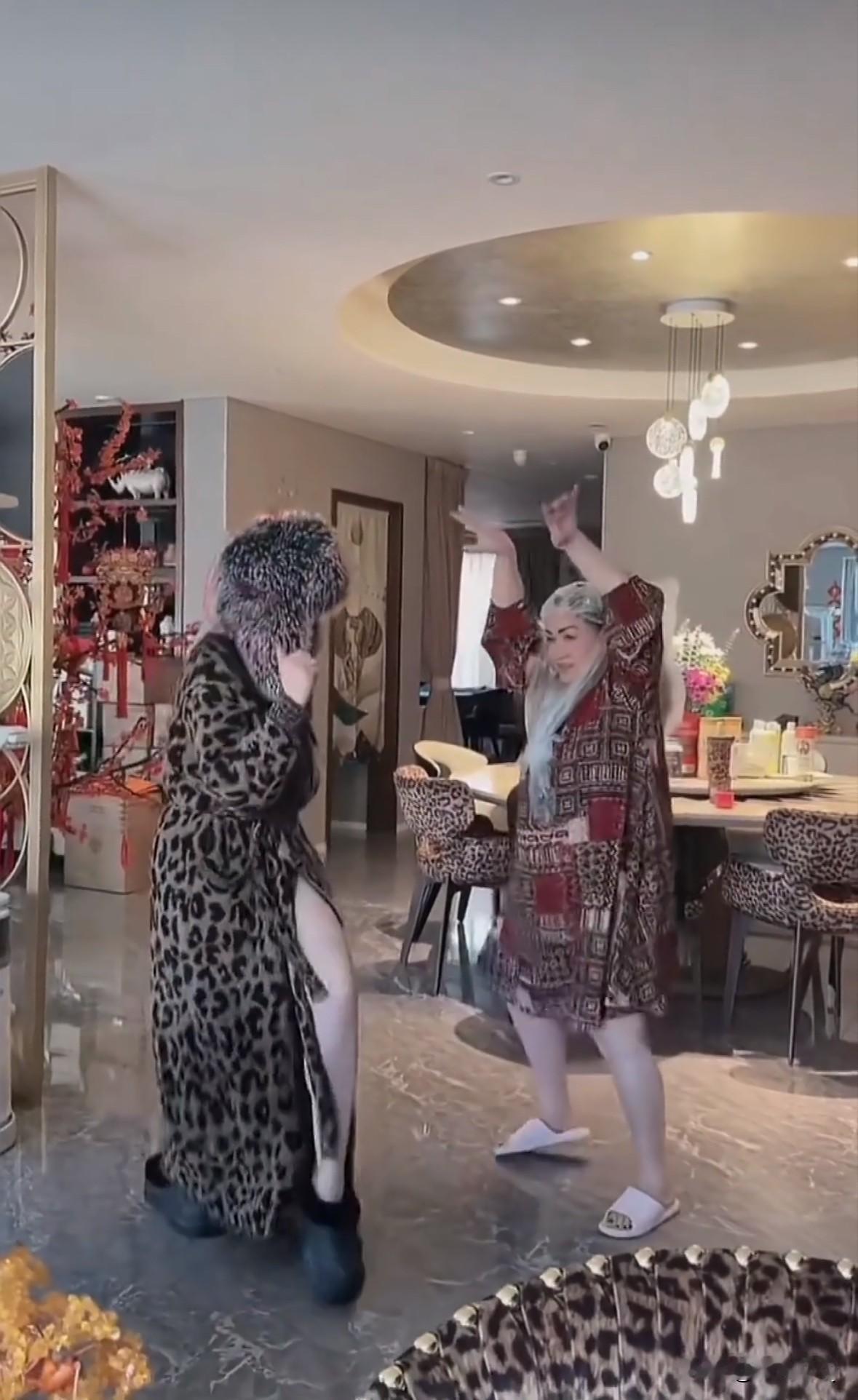 钟丽缇和母亲在家欢乐共舞,钟丽缇穿得是真夸张,豹纹长款大衣配皮草帽,身材丰腴,性感又野性。