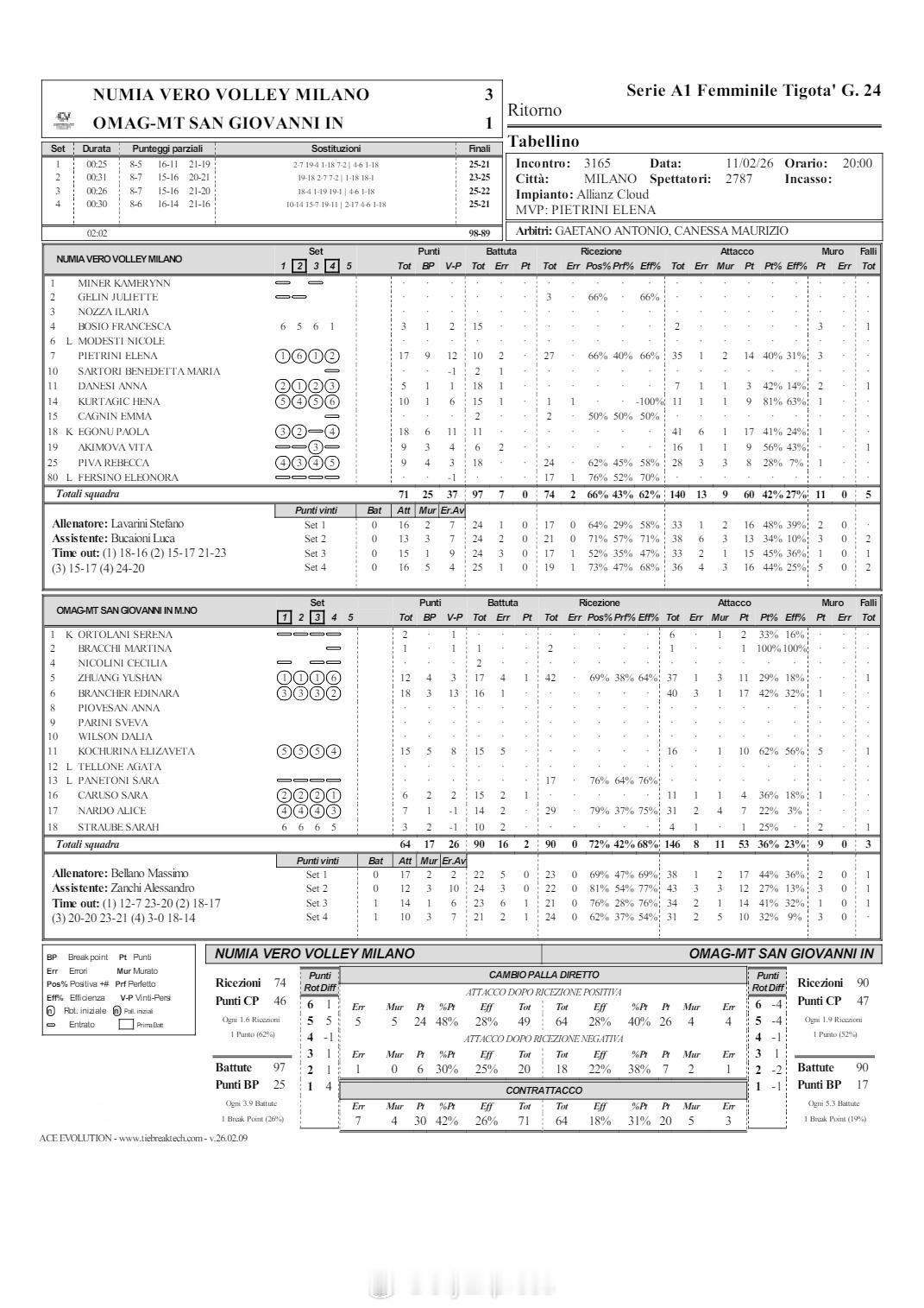 【意甲女排圣乔瓦尼1-3米兰 庄宇珊12分埃格努18分】中国排球留洋动态国际排坛战报速递 2月11日米兰,意甲女排第24轮,圣乔瓦尼客场1-3(21-25/25-23/22-25/21-25)不敌米兰,7胜17负23分继续排名第10,在常规赛还有两轮的情况下,要保级仍不容有失。布兰切尔18分、科楚里娜15分、庄宇珊12分(37扣11中1发),埃格努18分、MVP皮耶特里尼17分、库尔塔吉奇10分。