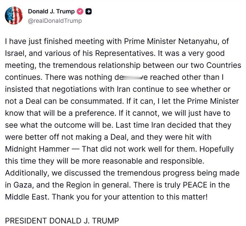 特朗普通过 Truth Social 发声:我刚刚结束了与以色列总理内塔尼亚胡及其多位代表的会面。会议非常成功,我们两国之间的卓越关系将继续延续。