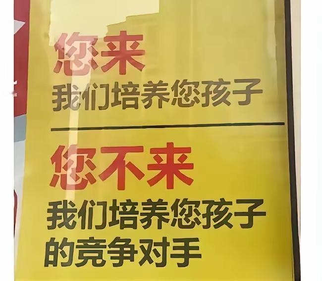 太狠了,简单粗暴!这个教培广告从传播效果看,它无疑是成功的,牢牢抓住了目标人群最脆弱的神经。不是吗? 高饱和黄底红字,它以这种最粗暴的视觉暴力和最冷酷的二元对立话术,完成了从“教育服务”到“生存威胁”的偷换概念。它的逻辑核心不是“我们能提供什么价值”,而是赤裸裸地宣告:“这里有一个零和游戏,你不加入,你的孩子就是被淘汰的那个分母。” “我们培养您孩子的竞争对手”——这句话堪称点睛之“恶”,它将教育异化为军备竞赛,将其他孩子客体化为需要超越和打压的“对手”,彻底玷污了学习本应具有的协作、探索与成长的内涵。 从社会效应审视,这种广告是有毒的。它在激化内耗、矮化教育格局的同时,也让“教育”二字的重量,从立德树人塌缩成了胜者为王的残酷博弈。 太坏了。