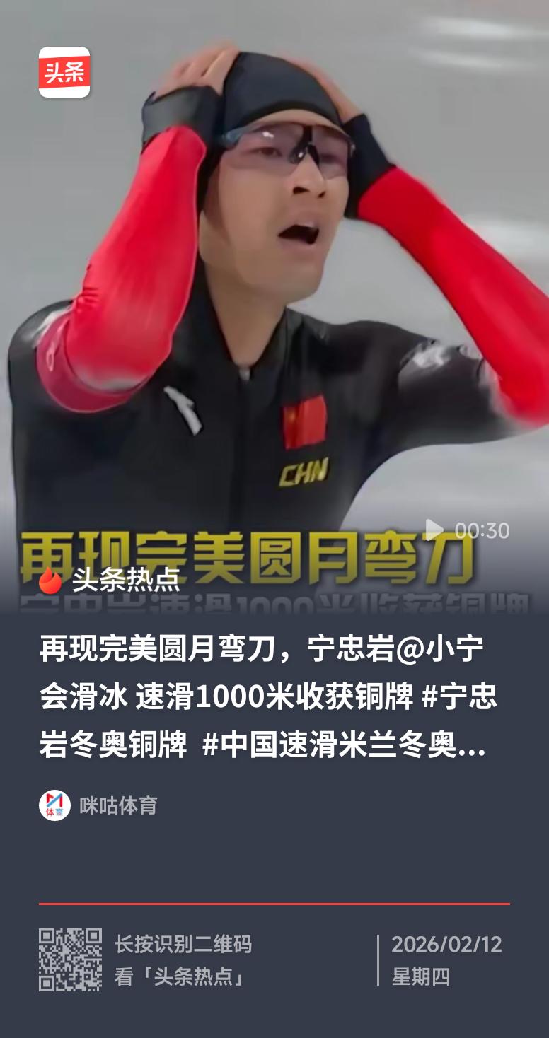 宁忠岩速滑男子1000米夺铜🔥热血沸腾!在2026米兰冬奥会速滑男子1000米赛场,宁忠岩以1分07秒3的成绩勇夺铜牌!冰刀划破赛道,汗水铸就荣光,他用速度与坚持,为中国速滑再添一枚奖牌。这不仅是个人的突破,更是中国冰雪健儿拼搏精神的最好诠释!为他喝彩,为中国骄傲!🇨🇳