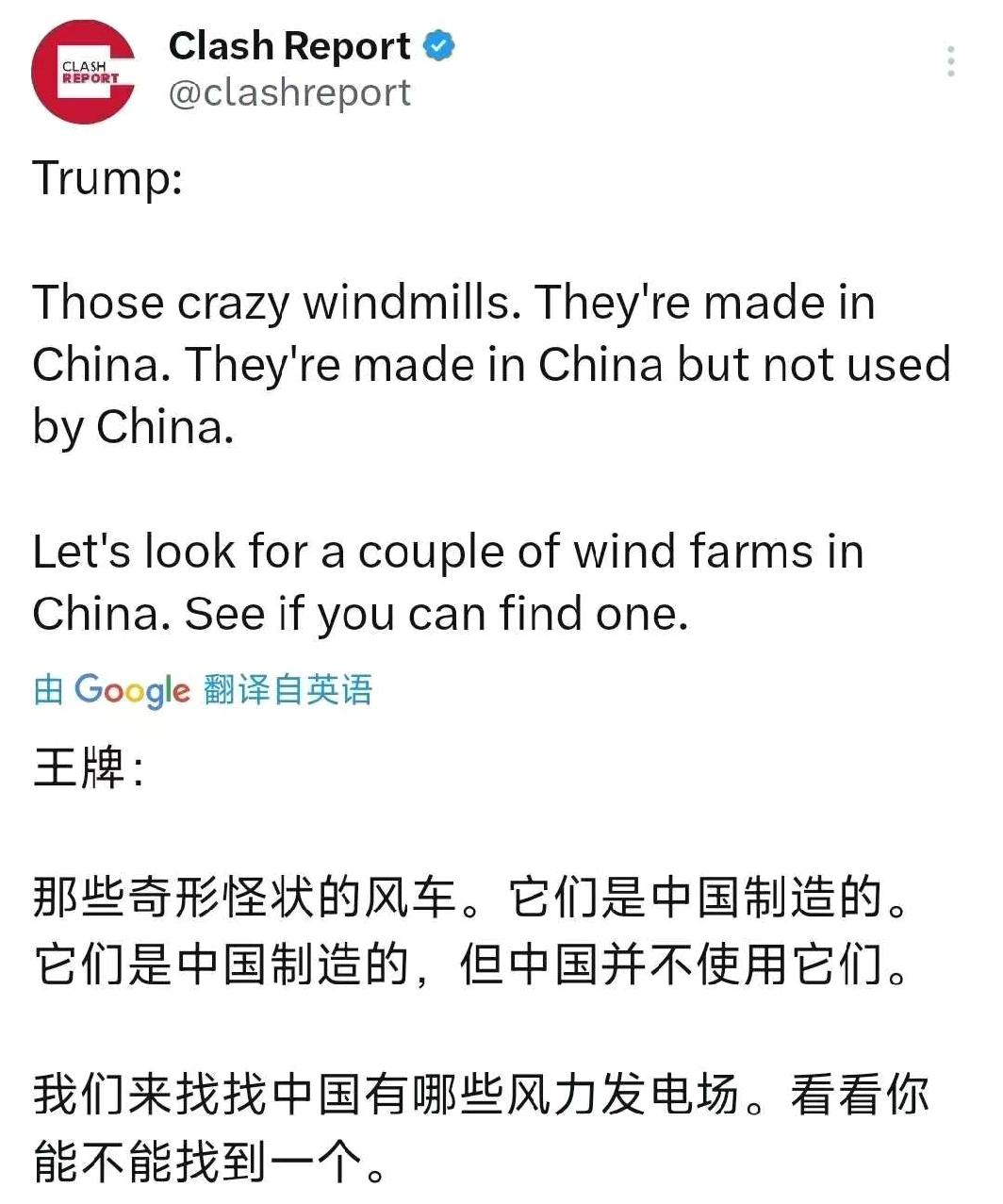 2月12日,特朗普又盯上中国风电,他表示:“那些奇形怪状的风车。它们是中国制造的