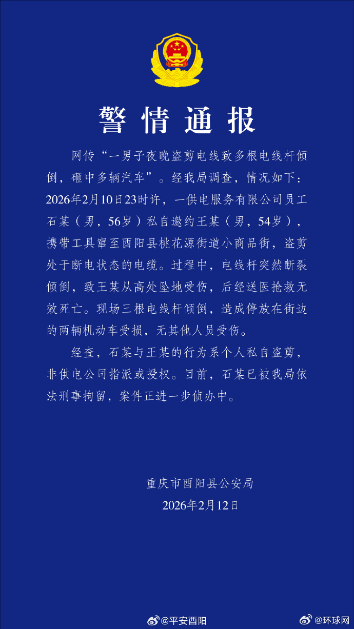 #警方通报两人盗剪电缆##男子盗剪电缆坠地身亡#【重庆酉阳县警方通报:两人夜晚盗剪电缆致多根电线杆倾倒,一盗剪者从高处坠地经送医抢救无效死亡】