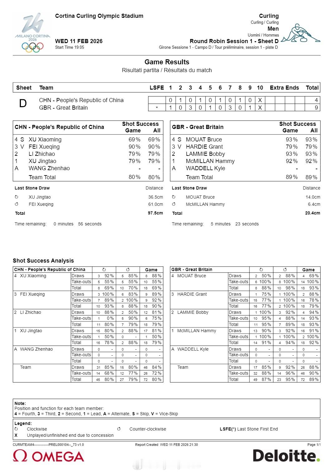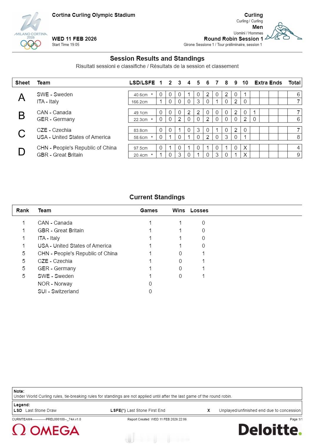 【冬奥男子冰壶中国队首战4-9不敌英国】冬奥会 2月11日,冬奥会男子冰壶比赛开赛,中国队首战4-9不敌实力强大的英国。其他三场瑞典6-7意大利、加拿大加局7-6险胜德国、捷克7-8美国。