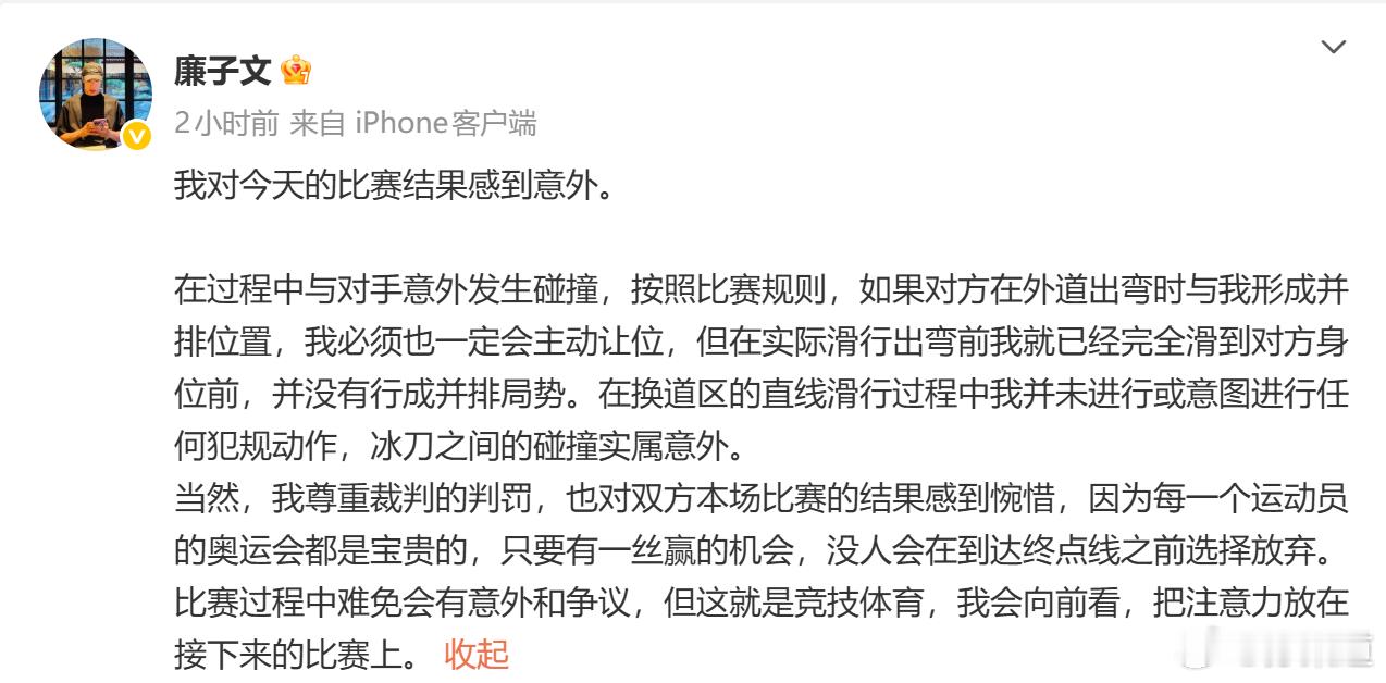 在过程中与对手意外发生碰撞,按照比赛规则,如果对方在外道出弯时与我形成并排位置,我必须也一定会主动让位,但在实际滑行出弯前我就已经完全滑到对方身位前,并没有行成并排局势。在换道区的直线滑行过程中我并未进行或意图进行任何犯规动作,冰刀之间的碰撞实属意外。当然,我尊重裁判的判罚,也对双方本场比赛的结果感到惋惜,因为每一个运动员的奥运会都是宝贵的,只要有一丝赢的机会,没人会在到达终点线之前选择放弃。比赛过程中难免会有意外和争议,但这就是竞技体育,我会向前看,把注意力放在接下来的比赛上。冬奥会