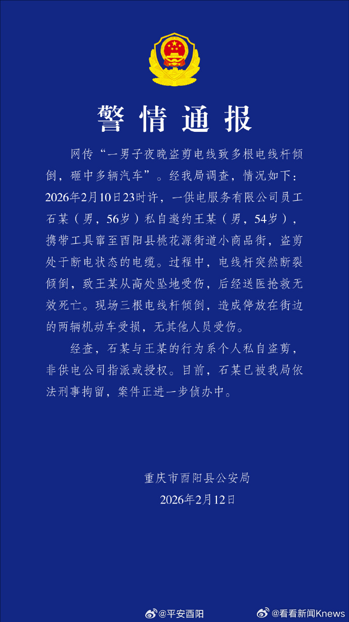 【#警方通报两人盗剪电缆致1死#】2月12日,通报:网传“一男子夜晚盗剪电线致多根电线杆倾倒,砸中多辆汽车”。经我局调查,情况如下:2026年2月10日23时许,一供电服务有限公司员工石某(男,56岁)私自邀约王某(男,54岁),携带工具窜至酉阳县桃花源街道小商品街,盗剪处于断电状态的电缆。过程中,电线杆突然断裂倾倒,致王某从高处坠地受伤,后经送医抢救无效死亡。现场三根电线杆倾倒,造成停放在街边的两辆机动车受损,无其他人员受伤。
