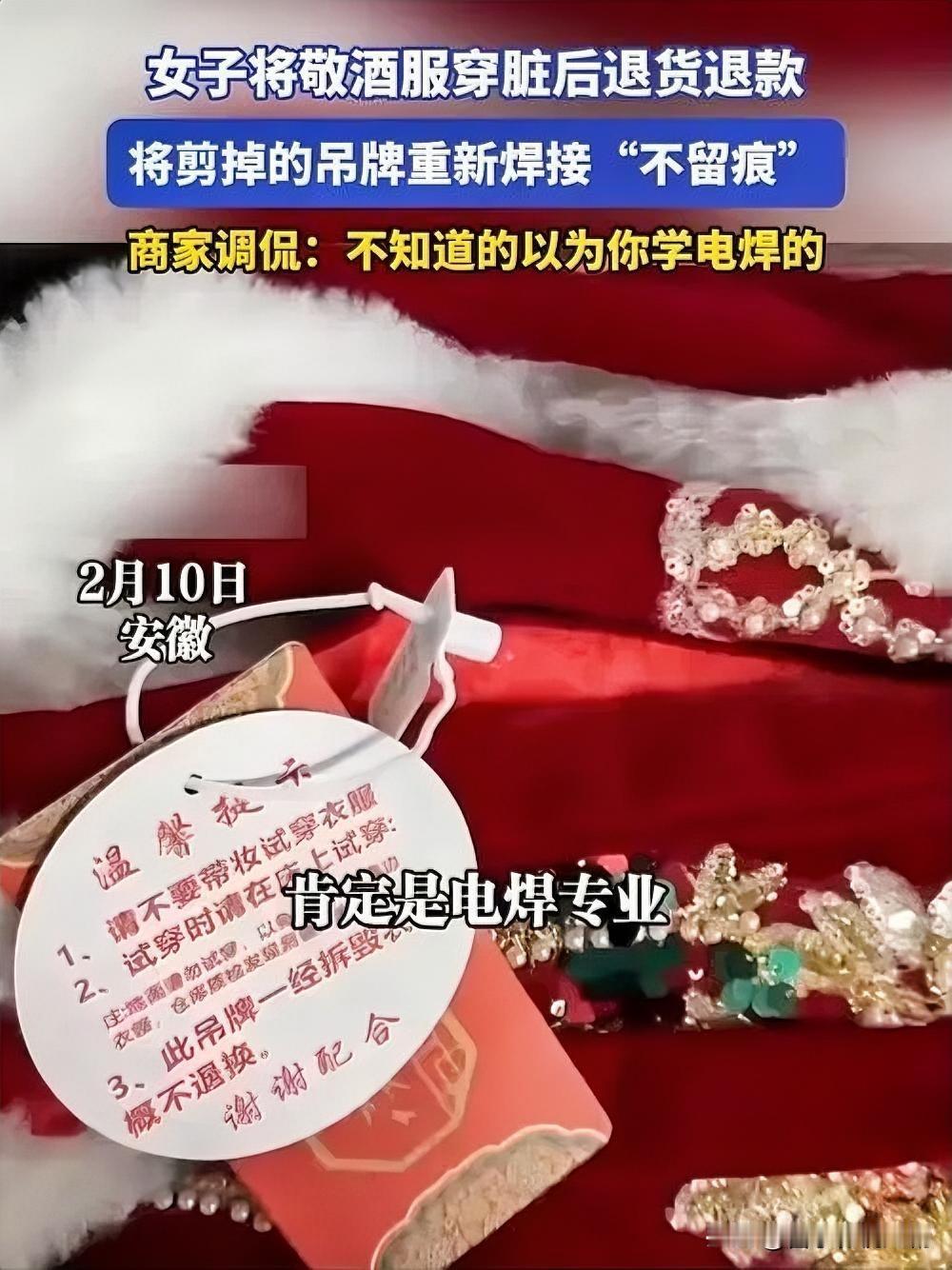 😡太离谱!一女子网购敬酒服,穿过后竟穿着它去焊接,衣服沾满污渍、满是破损,还把吊牌重新焊接上,堂而皇之地申请退货。商家收到货后直接傻眼,拒绝退货后还遭女子投诉。这波操作真是刷新下限,消费不是占便宜,诚信才是基本底线。如此恶意退货,损害商家权益,破坏市场秩序,必须予以谴责!