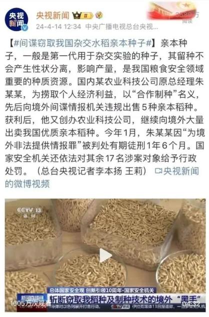 “应该立即死刑!”央视新闻在2024年4月14日曝光了一起惊天大案:我国杂交水稻之父袁隆平教授的心血结晶——亲本种子,竟被一名名为朱某的间谍公然走私给外国势力,经审理后朱某被判有期徒刑一年六个月,但这一判决在社会上激起了广泛的关注和激烈的争议。 袁隆平院士穷尽一生培育出来的杂交水稻,从来都不只是一种高产农作物,而是中国在极端环境下依然能稳住十几亿人饭碗的底气,是几代科研人员顶着烈日、泡在田里、熬过无数失败才攥在手里的国之重器,而亲本种子,就是这一切技术的源头。 它一旦外流,就不是简单的资源流失,而是整个育种体系被人从根上挖走,朱某身为业内人士,比谁都清楚这些种子的分量,也比谁都明白国家对核心种质资源严格禁止外流的规定,可他还是在利益面前低下了头,用合作制种做掩护,把五种至关重要的亲本材料分批送到境外势力手中, 他不是一时糊涂,不是无心之失,而是明知故犯、主动配合,把国家的底牌当成了换取私利的筹码。 消息公布之后,舆论的愤怒几乎是瞬间爆发,大家愤怒的不是判决本身的条文,而是一种强烈的不公感,是有人用一己贪欲,毁掉了无数人用一生守护的成果,袁隆平院士一辈子的心愿,就是让中国人把饭碗牢牢端在自己手里,不让任何人再用粮食卡住我们的脖子, 可朱某做的,却是亲手把饭碗的底交给了别人,这种对比,足以让每一个普通人感到心寒,也足以让大家意识到,粮食安全从来都不是一句口号,而是有人在默默坚守,也有人在暗中破坏。 把这件事放到更大的视野里看,它根本不是孤立事件,而是全球粮食博弈这场无声战争里的一次精准偷袭。 今天的世界,粮食早已不是普通商品,而是大国较量中最锋利、最隐蔽的武器,谁掌握了种源,谁就掌握了粮食的未来,谁掌握了粮食,谁就掌握了主动权,跨国种业巨头常年用专利、技术、标准构筑壁垒,把最核心的种质资源牢牢攥在手里,对发展中国家形成层层压制。 很多国家就是因为丢失了种源自主权,不得不常年高价购买种子,一旦遇到冲突和制裁,立刻陷入粮食危机,中国之所以能在一次次全球粮价波动中稳住阵脚,就是因为我们守住了核心技术,守住了亲本种子,守住了农业的芯片。 更让人警惕的是,这起案件暴露出的,不只是个人的背叛,还有外部势力长期、系统、精准的渗透,这些年,针对中国种业、粮食、种质资源的窥探从来没有停止过,境外势力披着科研合作、商业投资、技术交流的外衣,渗透到田间地头、科研院所、种子企业, 用远超正常收益的利益诱惑关键岗位的人,用碎片化的方式搜集核心信息,他们的目标非常明确,就是要破解中国粮食自给的根基,就是要在未来可能出现的博弈中,掌握拿捏我们的筹码,和平年代,大家感受不到粮食危机的恐惧,可一旦风云突变,种子安全就是生命线,就是生存权。 很多人会把这起案件和科技领域的芯片封锁放在一起比较,这并不是牵强附会,而是两者的逻辑完全一致,美国对中国高科技产业的打压,是卡住高端技术的脖子,境外势力对我们亲本种子的觊觎,是卡住粮食安全的脖子, 一个影响发展,一个关乎生存,两者都是在和平年代打响的没有硝烟的战争,都是瞄准我们最薄弱、最关键的环节下手,都是想通过破坏核心竞争力,来迟滞我们前进的脚步,这也是为什么网友会对判决如此在意,因为大家心里都清楚,背叛国家根基的行为,必须付出足够沉重的代价。 这起案件给我们所有人敲响了警钟,粮食安全没有局外人,种业防线没有松懈时,一粒种子看起来微不足道,却能决定一片田野的收成,决定一个国家的底气,决定无数家庭的安稳,我们既要继续强化种质资源的全链条保护, 从科研到生产,从储存到运输,每一个环节都不能留下漏洞,也要加强对关键岗位人员的安全意识教育,让每个人都明白,手中的技术、接触的资源,背后连着的是国家命运。 袁隆平院士留下的,不只是高产的水稻,更是一种信念,那就是中国人的饭碗,必须端在自己手里,任何人想从内部破坏这份安稳,想把国家的核心利益拱手让人,都会被亿万民众看在眼里、记在心里,都会遭到最坚决的抵制和最严厉的惩戒, 粮食安,则天下安,种子稳,则民心稳,在这个充满不确定性的世界里,守住一粒种子,就是守住亿万饭碗,守住一道防线,就是守住一个民族的未来。
