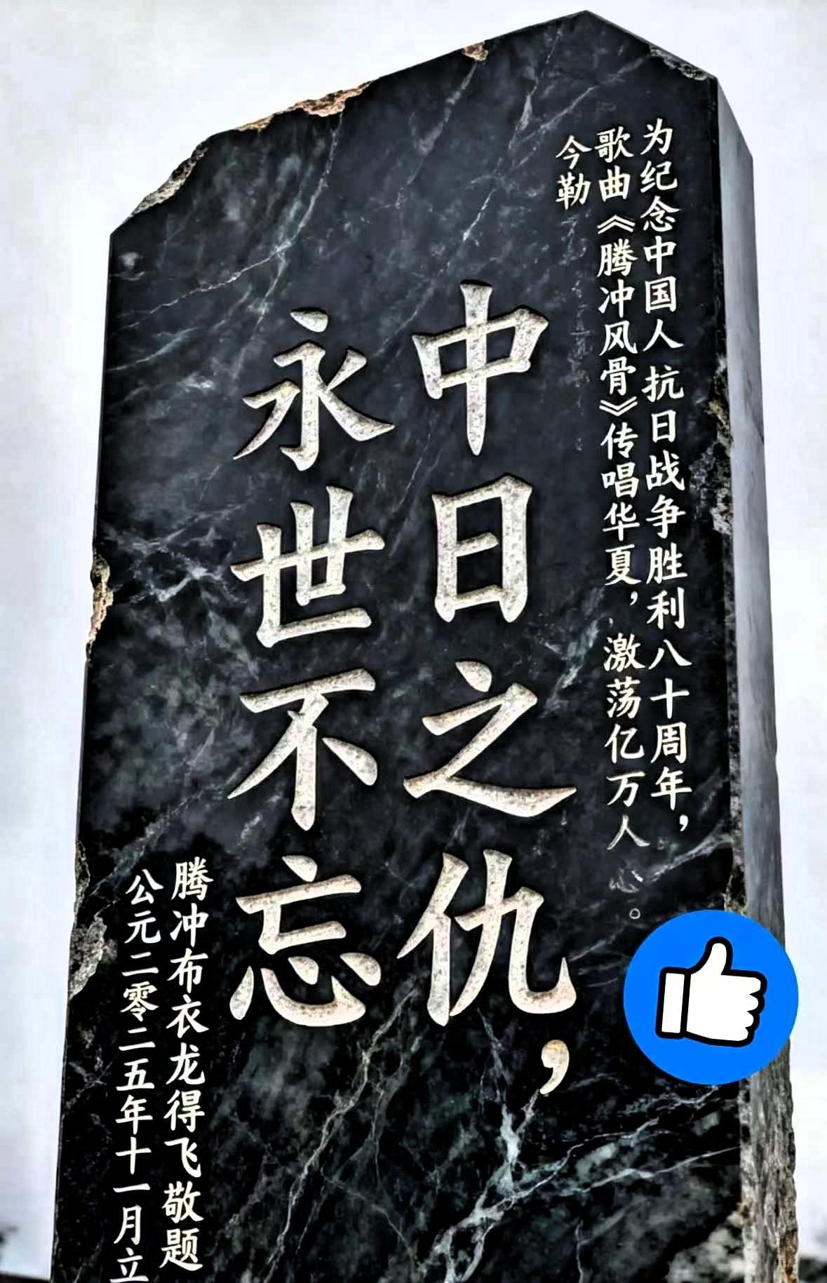 这块碑太硬气了,看得我头皮发麻。 “中日之仇,永世不忘。” 在云南腾冲界头玄天宫门前,立着一块十分特别的石碑,上面刻着“中日之仇,永世不忘”八个字,直白而庄重,承载着当地一段沉重的历史过往。 相比日常里温和的表述,这块碑的文字显得格外直白,它不是刻意的偏激表达,而是源于滇西抗战时期,腾冲人民经历的苦难与抗争,是当地百姓对历史最真实的铭记。那段山河动荡的岁月里,无数同胞为守护家园付出生命,这样的记忆,刻在石碑上,也留在当地人的骨子里。 如今网络上,有人分享这块石碑的照片,却会遭到个别人员的举报,这种做法让很多人难以理解。铭记历史,本是每个国人应有的态度,我们铭记过往,不是为了延续对立,而是为了牢记和平的珍贵,不让先辈的牺牲被淡忘,不让历史的教训被忽视。 石碑静静矗立在腾冲,它是历史的见证,也是民族记忆的载体。它没有华丽的修饰,却用最朴素的文字,提醒着后人不忘来路、珍惜当下。那些试图通过举报掩盖这段记忆的行为,既改变不了历史,也动摇不了国人铭记历史的初心。 一个民族的底气,从来都来自对历史的正视与坚守。腾冲的这块碑,代表的不是对立,而是敬畏历史、缅怀先烈的本分,是刻在中国人骨子里的家国情怀。它不张扬、不偏激,却有着直抵人心的力量,让每一个了解历史的人,都心生敬畏。 历史不容淡忘,风骨更需坚守。