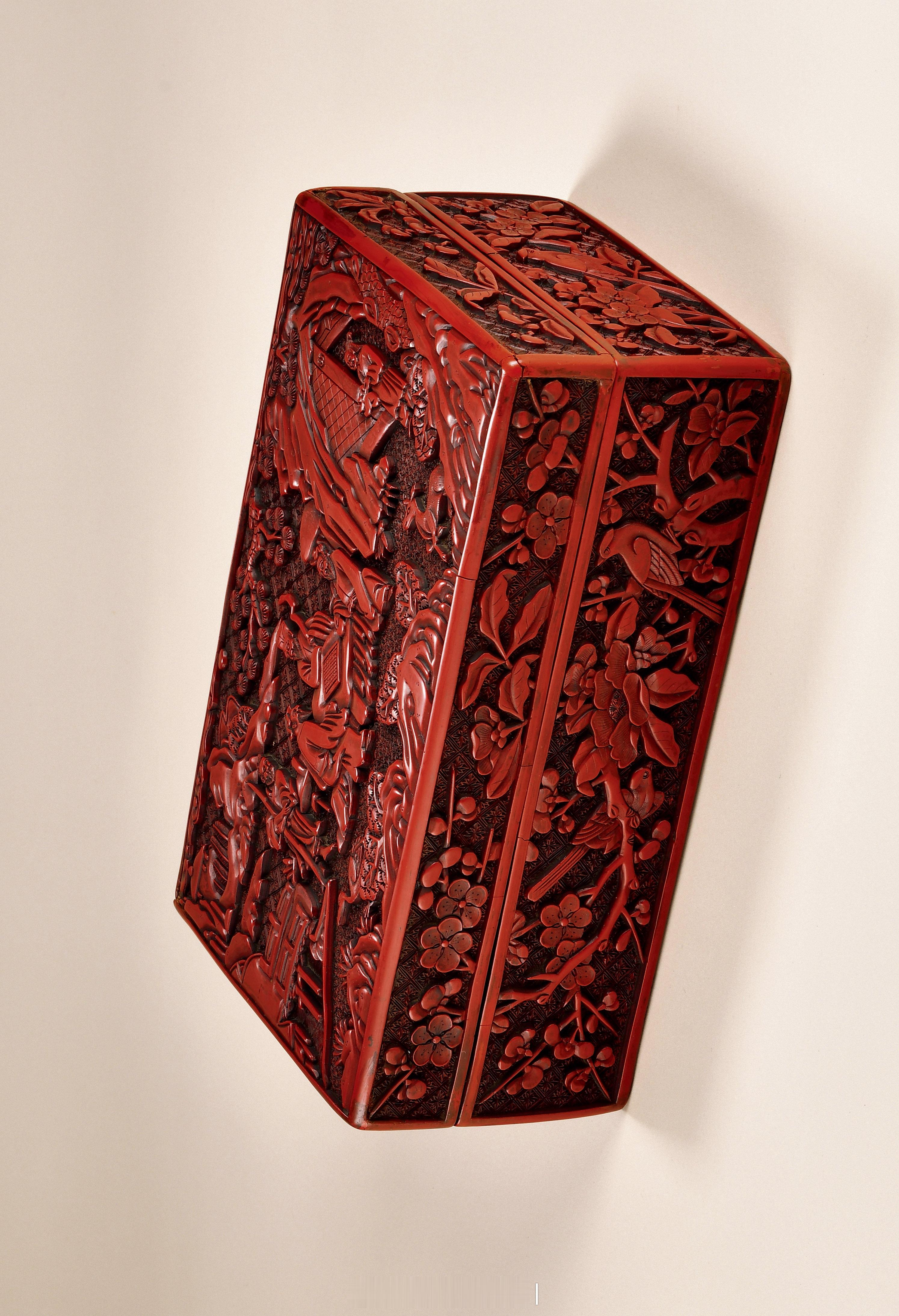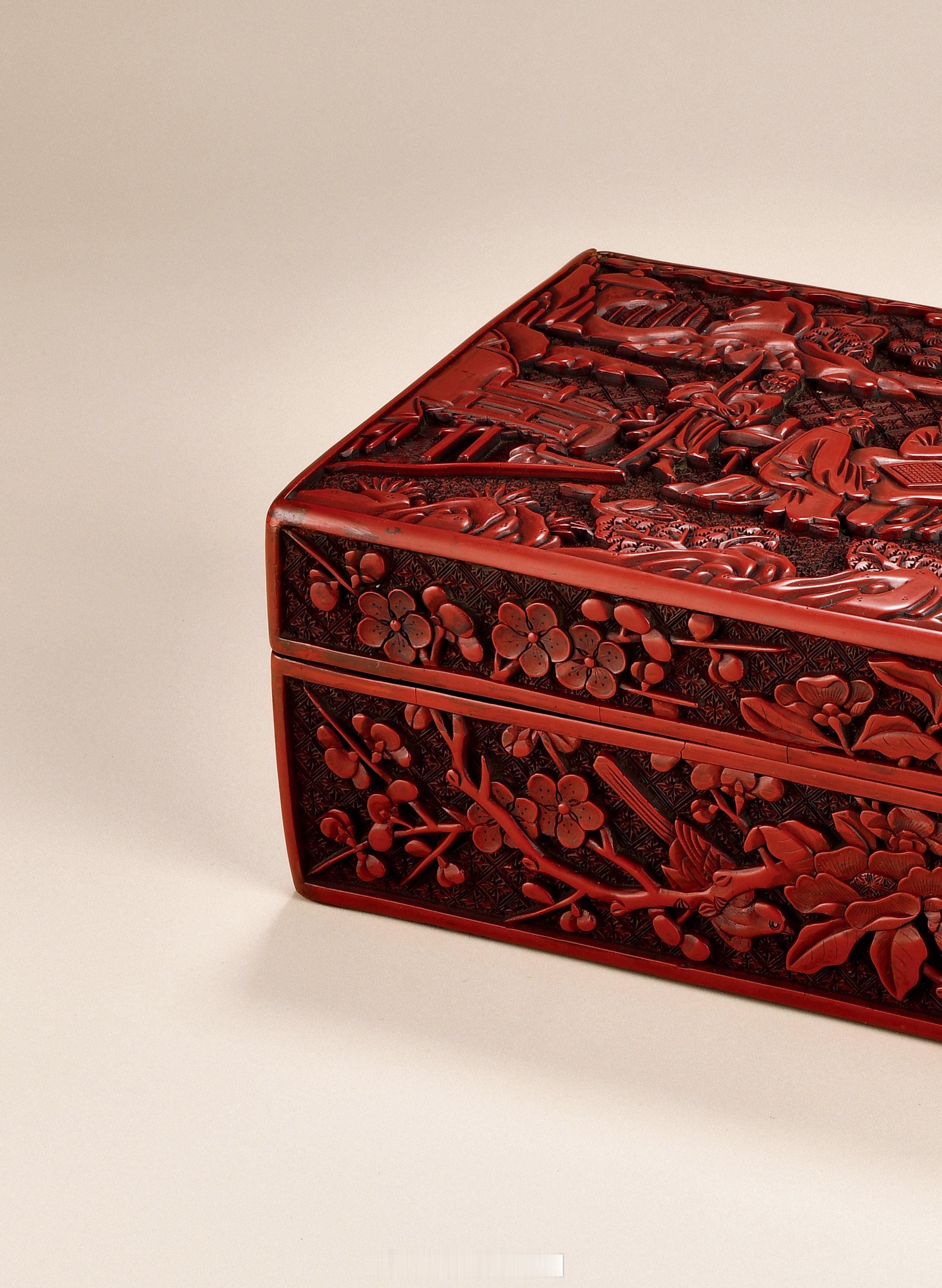 器作长方形盒状,整体由盒盖和盒身两部分组成。直口直身直壁。平底平面。通体除盒内壁和盒底髹饰褐黑色大漆外,余地均髹饰朱红色大漆,并剔刻以画面纹饰。其中,盒面以三位年长对弈的高士为中心,表现了一副闲庭高士对弈图,画面中,三位高士鹤发童颜,笑意盈盈的端坐在棋桌周围,谈笑风生,对弈清谈。旁边一为年长的农夫或为精彩的棋局所吸引,放下了砍柴的斧头,抱着扁担赤足立于一旁静静地观看。画面右侧,一位女子端着酒食徐徐走来,一旁的小鹿机警的观望这一切。画面以两种不同锦纹为地,还表现了苍松翠柏、远山近水,小桥如虹,仙鹤似仙,一副恬静优美的庭院。盒盖盒身外的四壁,则分别剔刻了梅花、海棠、喜鹊等花鸟,画面春意漫漫,生机勃勃。纵览整个盒身所饰,其画面、纹饰各司其职,布局得当,疏密有度,在多次髹饰的漆面上剔刻,使得画面主次分明,简洁高雅而极富文人气息。其雕工细腻,磨工圆熟,为明代中期雕漆之精品。