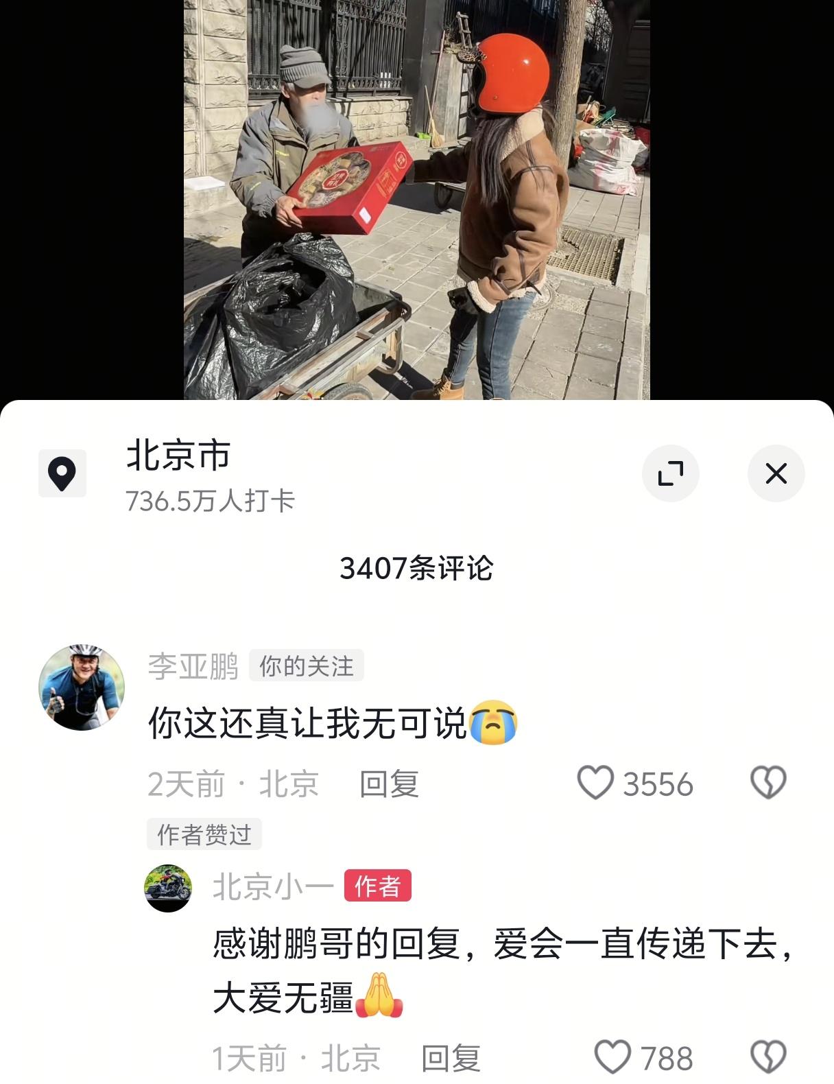 李亚鹏在直播间让大家理性消费别瞎买! 有个北京姑娘说,李亚鹏你说谁瞎买呢?我不接受你的建议!李亚鹏本人都回复了无话可说[捂脸] 这个姑娘在李亚鹏直播间买的东西,送给了送外卖的小姑娘,把大米送给了做环卫工的大妈,把坚果送给了捡垃圾的大爷,把零食送给了跑跑跳跳的孩子。 还真的没有瞎买,每一件东西都送的恰如其分。 在单位上班的,过年单位送年货,这些环卫工啊外卖啊收废品的啊!都是没有过年礼物的,小姑娘的礼物就是惊喜,这个小姑娘真的很善良。 这个做法既支持了李亚鹏,又帮助了别人,这不算瞎买,这是瞎买的更高境界吧!