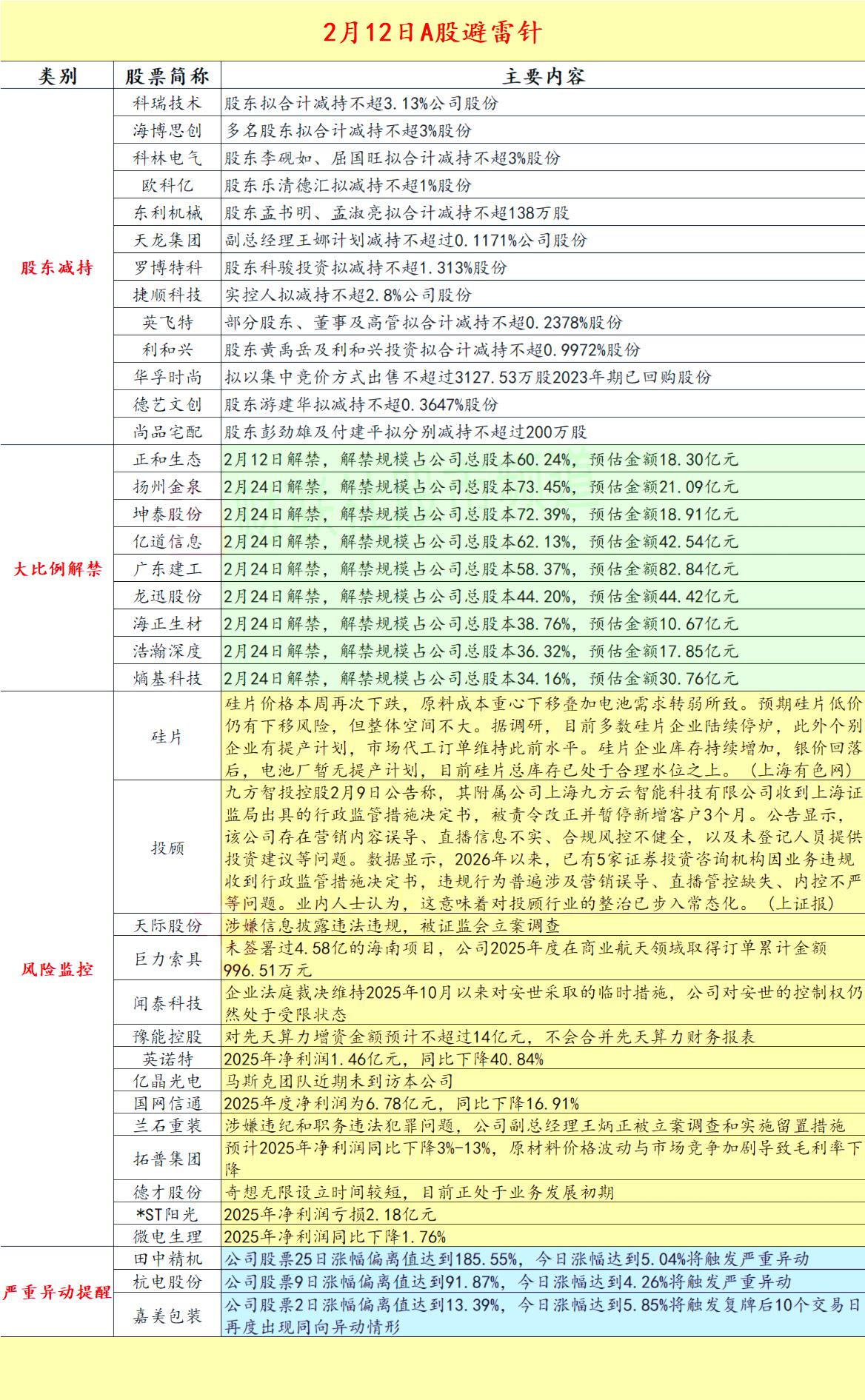 2026.2.12 A股拟减持,解禁,异动,风险警示