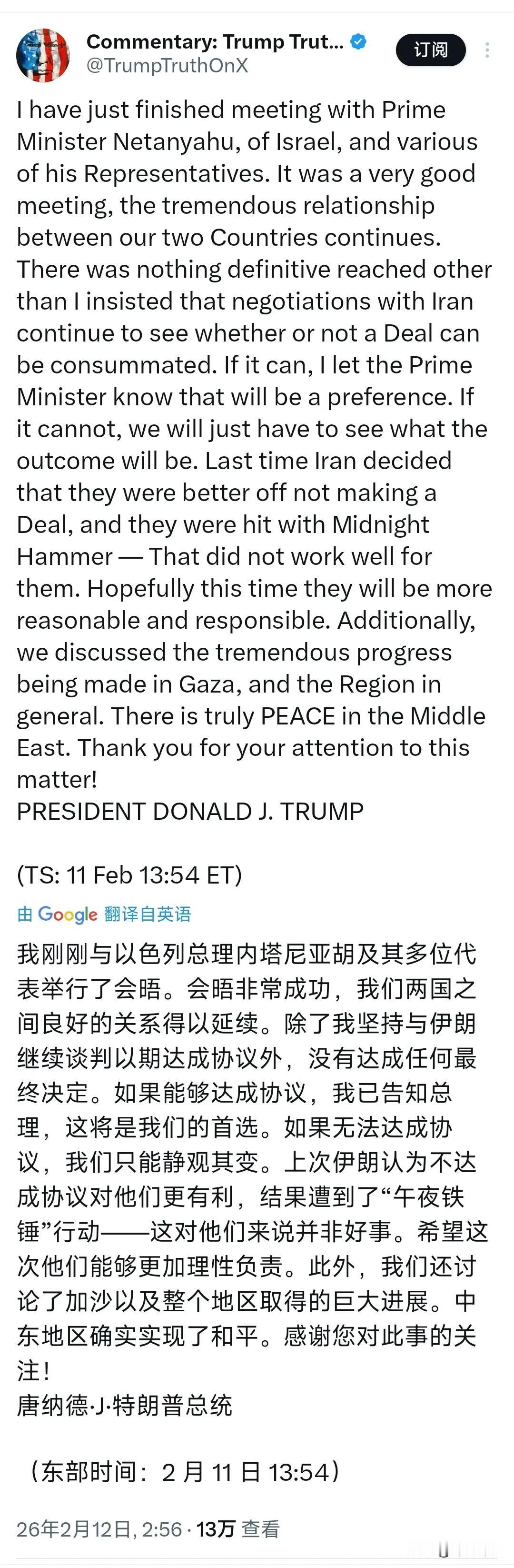 与以色列总理内塔尼亚胡结束会谈后,特朗普今天(北京时间2月12日)发文写道:“我刚刚与以色列总理内塔尼亚胡及其多位代表举行了会晤。会晤非常成功,我们两国之间良好的关系得以延续。除了我坚持与伊朗继续谈判以期达成协议外,没有达成任何最终决定。如果能够达成协议,我已告知总理,这将是我们的首选。如果无法达成协议,我们只能静观其变。上次伊朗认为不达成协议对他们更有利,结果遭到了‘午夜铁锤’行动这对他们来说并非好事。希望这次他们能够更加理性负责。此外,我们还讨论了加沙以及整个地区取得的巨大进展。中东地区确实实现了和平。” 评几句: 特朗普与内塔尼亚胡闭门密谈3小时,拒见记者、未发联合声明,操作透着不寻常。 随后放出“谈判首选”,看似温和,更像一枚烟幕弹。 内塔尼亚胡希望伊朗核与导弹项目彻底归零;伊朗则坚持自身立场。 双方诉求差距巨大,谈判难度可想而知。 更值得警惕:美军林肯号在印度洋就位,布什号战斗群奔赴中东。 双航母集结,是典型的军事威慑部署。 嘴上说“谈判优先”,手里却在强化军事存在。 谈判桌更像掩护部署的缓冲地带。 威慑到位、时机成熟,所谓“首选协议”,随时可能转向军事施压。 中东局势,正走向高度敏感的十字路口。 你觉得特朗普会动手吗?评论区聊聊!