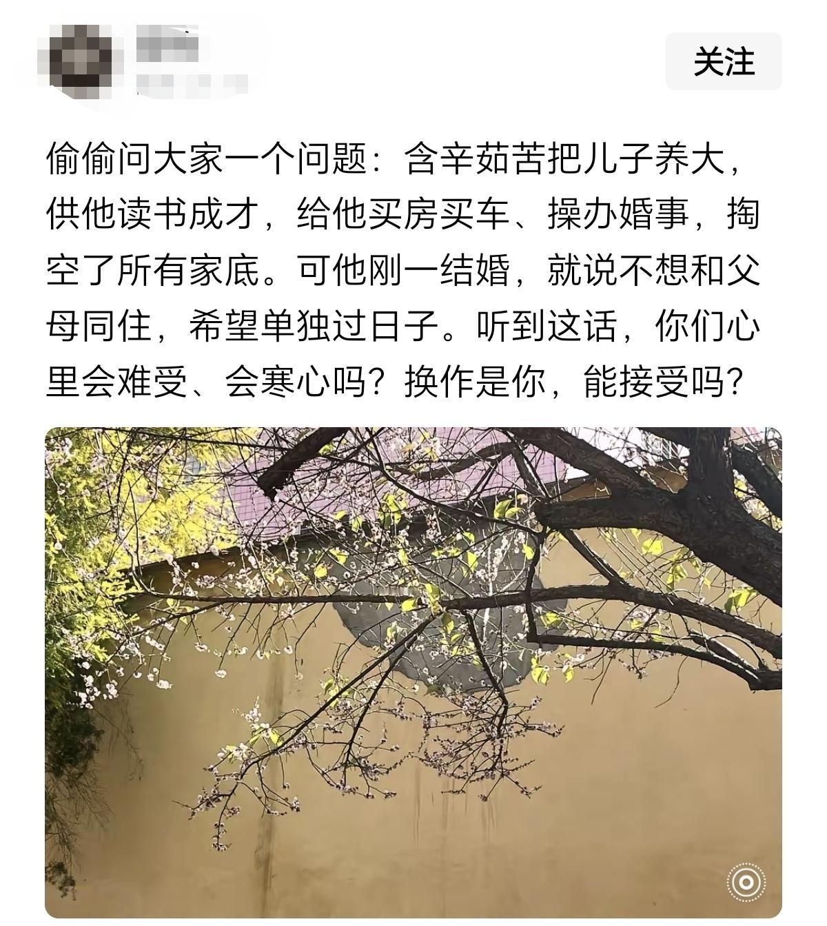 网友问:父母掏空家底,供儿子结婚。但他们想单独过,不愿意和父母同住,能接受吗?这个时候,作为父母,心态上要想的开,不要纠结。 儿子儿媳妇,小两口单独过日子,不跟父母住一起,这是非常正常的。在现实生活中,这样做,反而更能让家庭和睦。 真要儿子儿媳妇,公公婆婆住一起。时间久了,婆媳之间难免会有这样,那样的矛盾。有些时候,一些生活的小事,生活的琐事,都会引发争吵。 到时候,年轻人住的不自在,老年人住的也不自在。这样还不如分开过,大家各过各的。彼此之间都轻松自在。 节假日的时候,儿子儿媳妇可以去看望爸妈,爸妈也可以偶尔来儿子家住住。这样不但没有矛盾,两代人之间反而会更亲。 所以,作为父母,不跟儿子儿媳妇同住,是明智的选择,心里不用纠结。