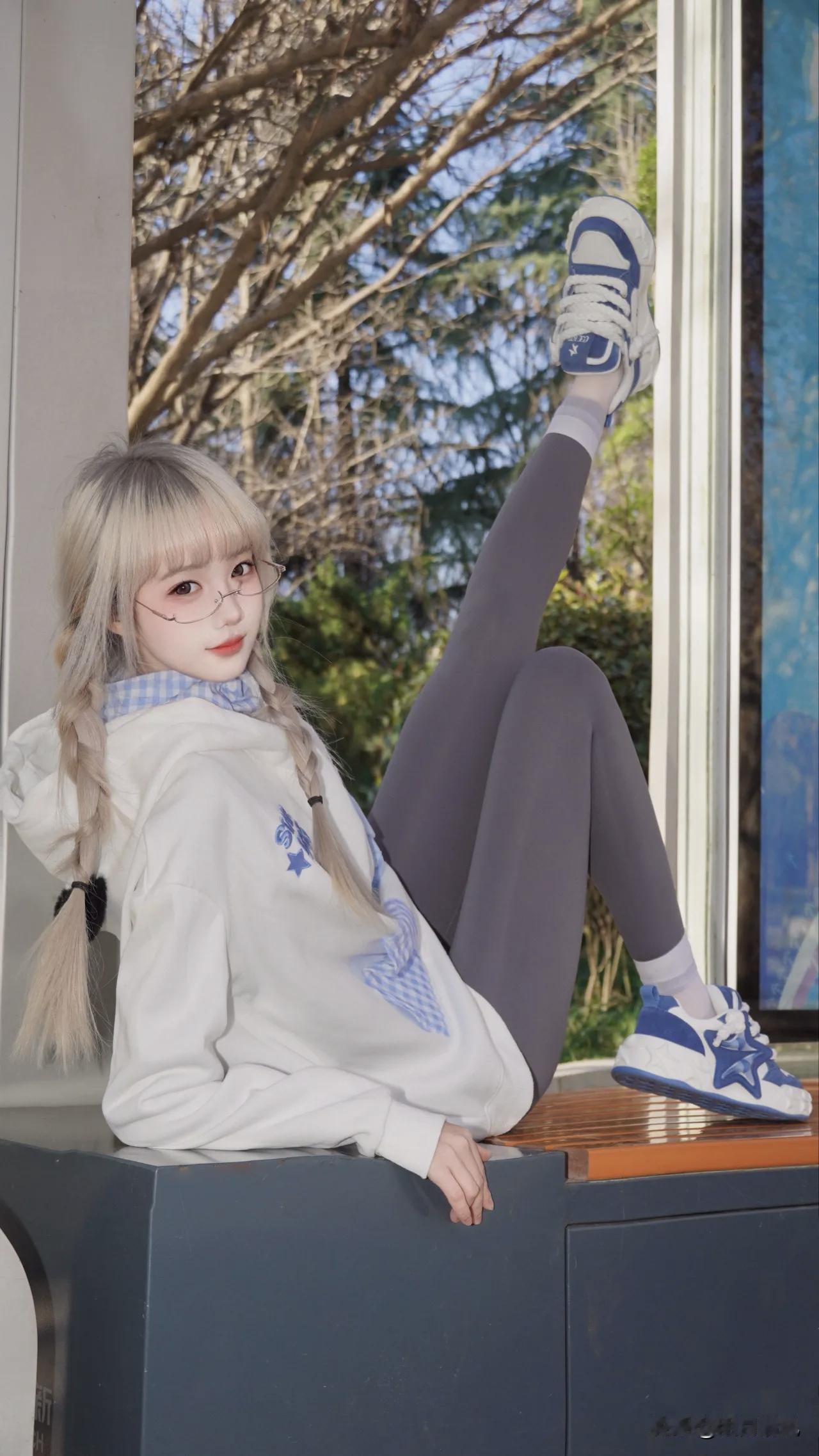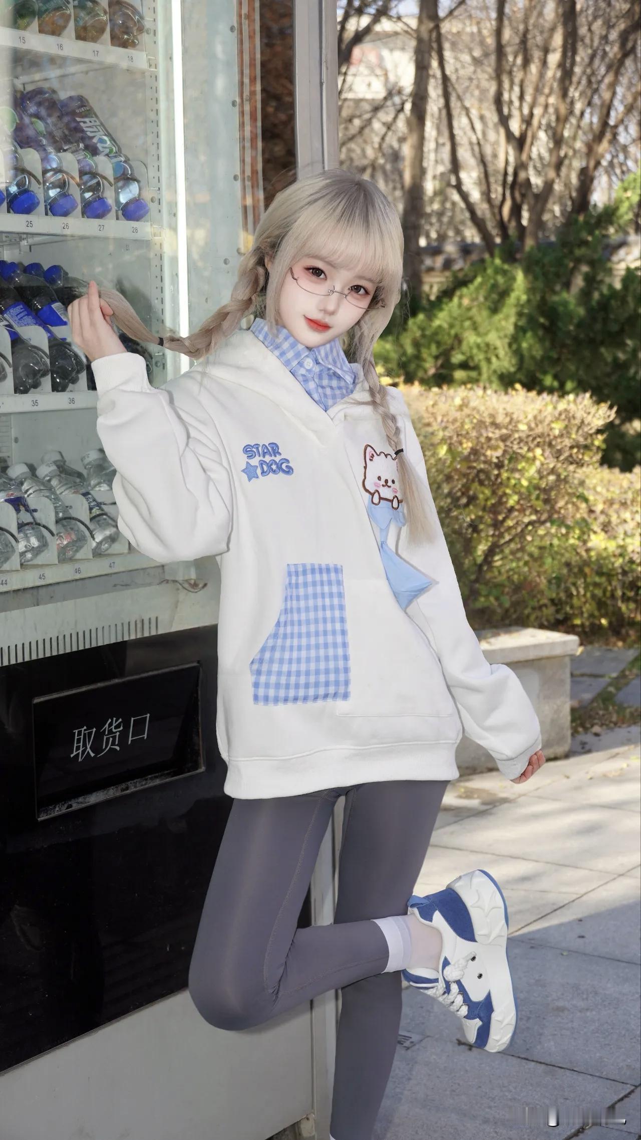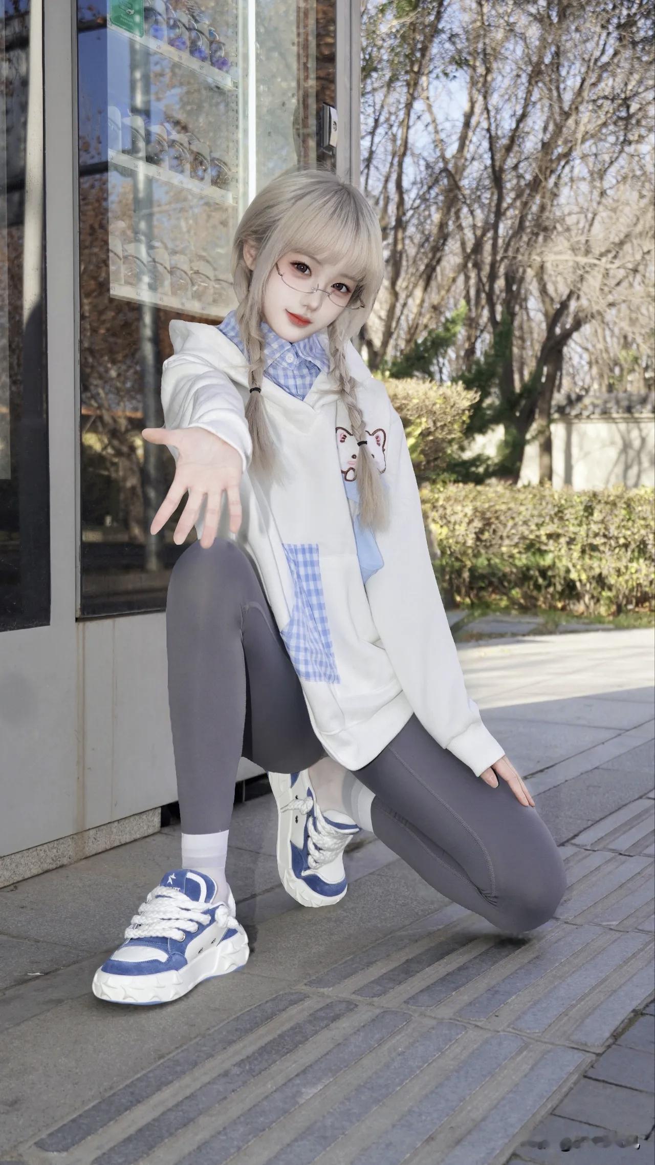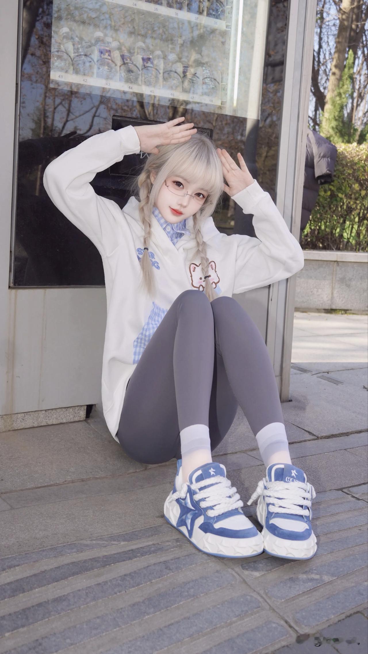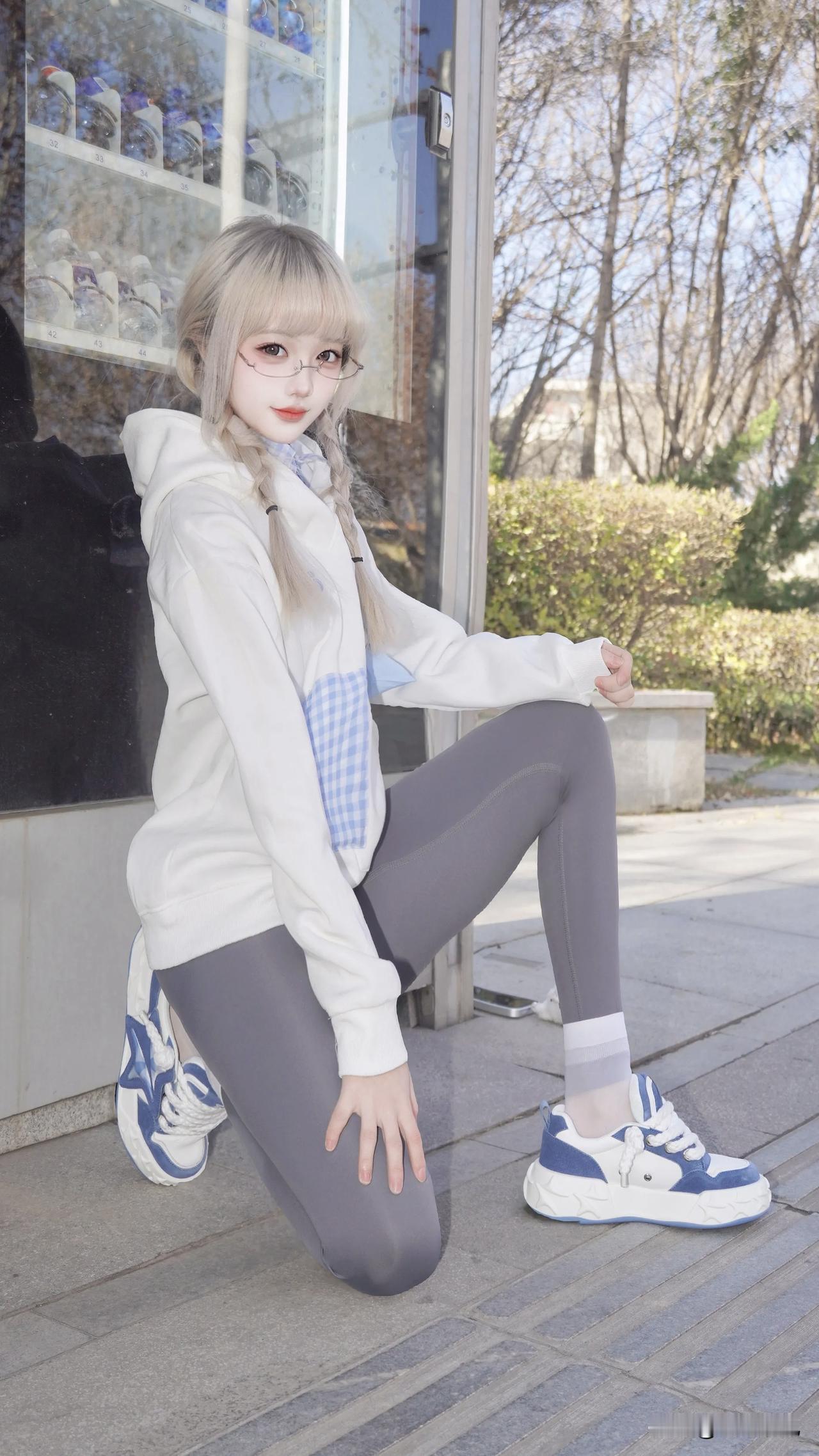 自动售货机真是冬天的天然摄影棚——玻璃反光自带柔焦,树影一打,整条街都变干净。 但很多人忽略了,这组场景的核心其实不是动作,是配色。 白卫衣+灰紧身裤。上宽下窄,廓形堆出松弛感,灰色把腿收成一条直线。站在售货机前面,不用凹得太满,身上只有两个颜色,画面自然安静。 一定要说的话,白里透一点蓝格衬衫领是聪明的加法——不破坏干净,又多了一层清爽。蓝白灰搭在一起,冬日晴天的光一照,玻璃、砖地、鞋边全是通透的。 动作其实是顺着穿搭走的:卫衣够大,就做抬手“框”住脸、拎辫子停顿这种轻巧动作;裤子包腿,就做抬腿拉线条、低重心蹲姿,把腿部比例亮出来。 衣服已经把氛围搭好了,人只要站在光里,轻轻动一下,画面就有了。 集卡领红包时尚穿搭 穿搭技巧