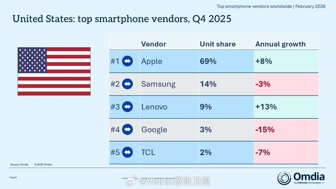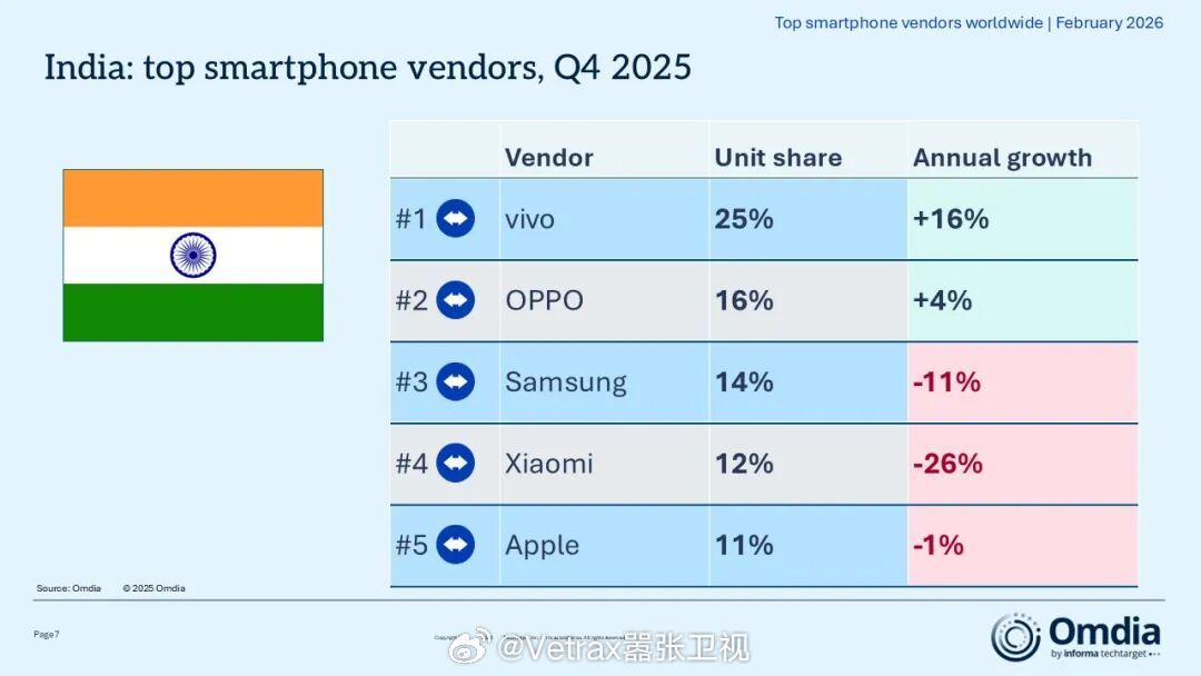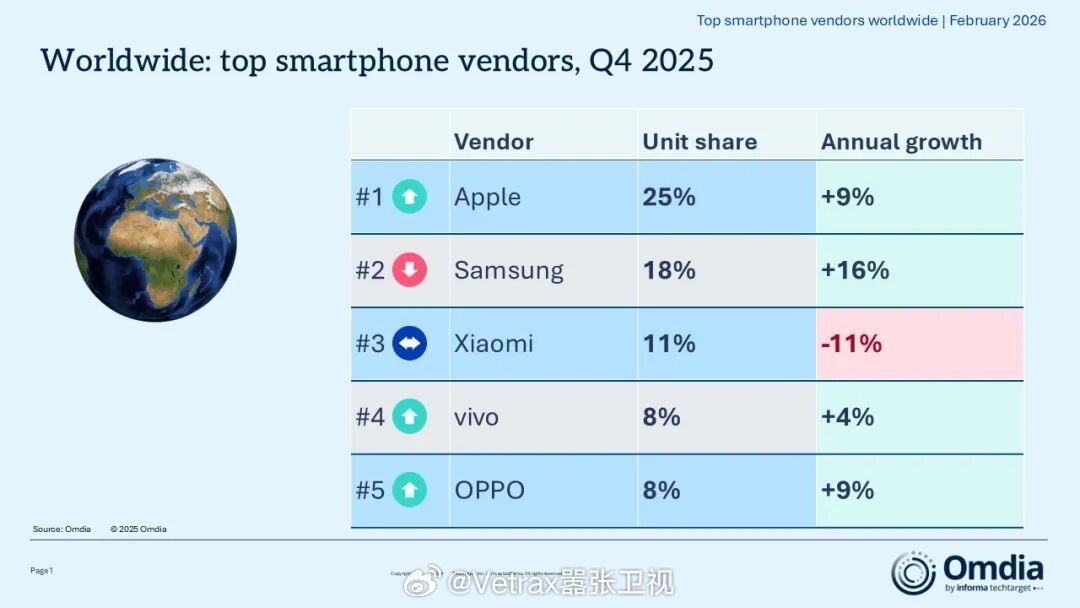 Omdia(Canalys)的经典项目『数据快闪』又来了,这次是全球重点市场的 2025Q4 智能手机 TOP5:
