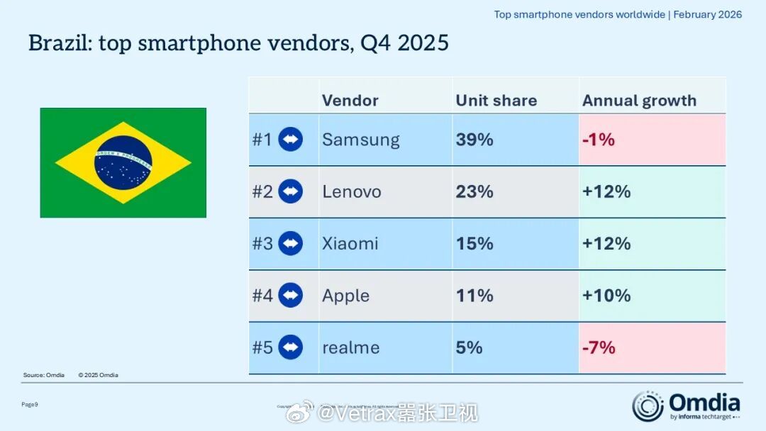 巴西市场:三星(39%)>联想(23%)>小米(15%)>苹果(11%)>realme(5%)
