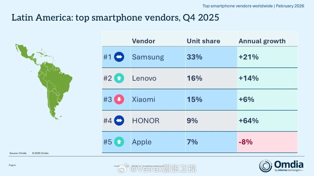 拉丁美洲市场:三星(33%)>联想(15%)>小米(15%)>荣耀(9%)>苹果(7%),荣耀超高速增长,联想在被小米超越了两个季度之后又重新回到第二名