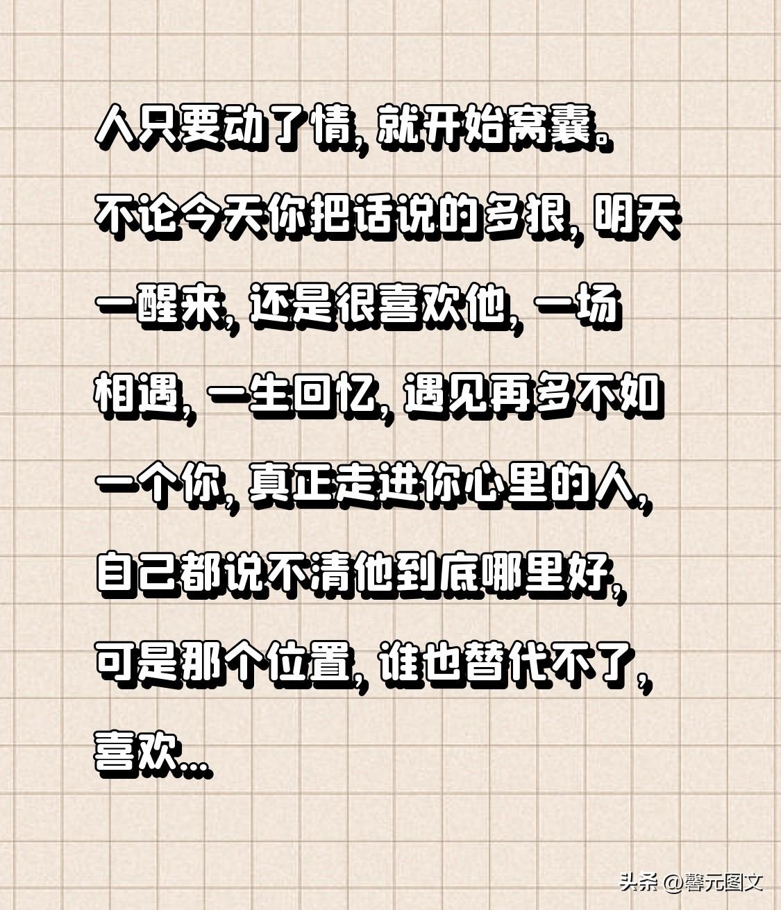 人只要动了情,就开始窝囊。不论今天你把话说的多狠,明天一醒来,还是很喜欢他,一场相遇,一生回忆,遇见再多不如一个你,真正走进你心里的人,自己都说不清他到底哪里好,可是那个位置,谁也替代不了,喜欢是棋逢对手,而爱是甘拜下风,遇见千万人,不及一个你,心动是棋局,而爱是落子无悔