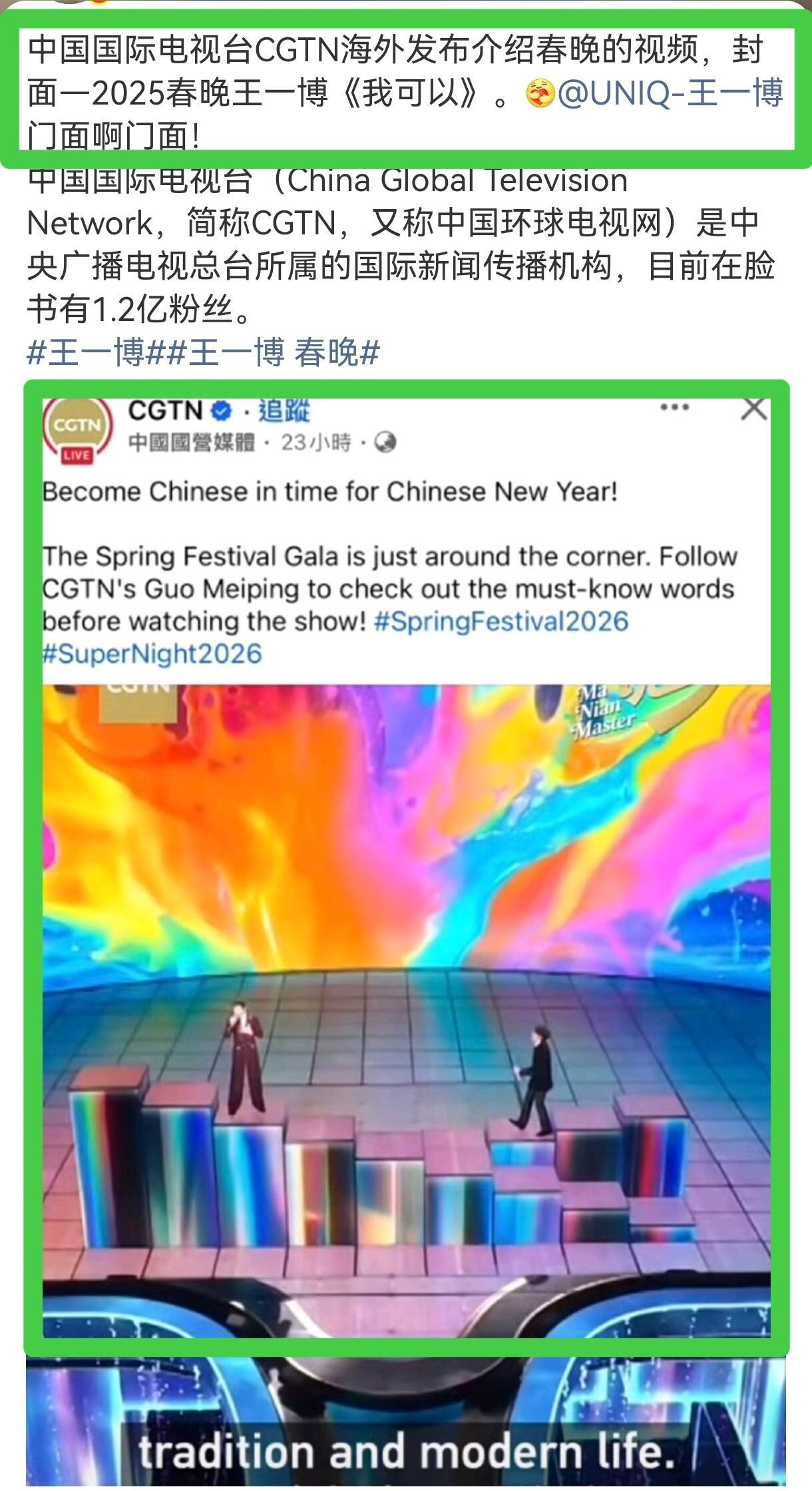 王一博外宣门面的含金量还在上升,牛哇直接用作封面来对外宣传春晚中国国际电视台(China Global Television Network,简称CGTN,又称中国环球电视网)是中央广播电视总台所属的国际新闻传播机构,目前在fb有1.2亿粉丝。