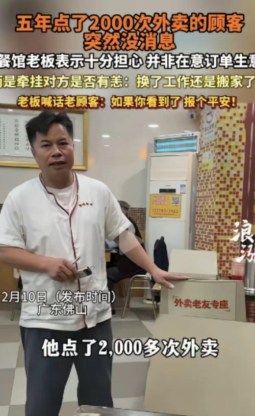 广东佛山,一男子开了家粤菜馆,有个顾客5年点了2000次外卖,突然1年多都没下单,男子很是牵肠挂肚,他不是想挣这个顾客的钱,而是担心对方的安危,不知道是换工作了还是搬家了,男子喊话:如果你看到了,报个平安! 佛山禅城的街头,藏着一家不起眼的粤菜馆,老板陈叔四十多岁,手巧嘴笨,做菜好吃却不爱吆喝,最近却因为一件“不赚钱”的事,悄悄暖遍了全网。 没有狗血剧情,没有刻意炒作,只有一份跨越5年、2000多单外卖的牵挂,和一句简单到极致的喊话,戳中了无数人的心。 陈叔开餐馆快8年,见过的顾客不计其数,能让他记挂大半年的,竟是一个从未谋面的“线上老熟客”。 外卖后台的记录清清楚楚,从2019年到2024年,整整5年,这个陌生ID一共下了2101单,平均下来每天都要在他这儿点上一餐,比很多人的三餐规律还要稳定。 没人知道这位老客的名字,陈叔甚至没听过他的声音,却把他的口味刻进了骨子里。 后厨的伙计都有了默契,只要这个ID下单,不用看备注就知道怎么做:白切鸡要选最嫩的鸡腿肉,豉汁排骨多给两块软骨,虾饺要捏得皮薄馅满,再配一碗清汤粥,全程少盐不辣,连打包盒都得用厚的,怕汤洒出来硌着对方。 陈叔不是图他的钱,反倒总想着“贴补给”这位老客,每天打包时,总会悄悄往袋子里多塞一颗卤蛋,或是一盅慢熬的猪骨汤,从不声张,也不额外收钱。 他私下跟伙计念叨,能天天点外卖的,大概率是一个人吃饭,要么是独居,要么是工作太忙顾不上开火,凑活不得,多一口热乎的,心里也踏实。 这份无声的默契,在一年多前突然断了,那个熟悉的订单,停在了2024年年中,起初陈叔以为是对方出差、换了口味,或是搬家换了地址,没太在意。 可一个月、两个月,大半年过去,后台再也没有新的动静,他心里的不安,越来越重。 他问过常去送单的外卖员,小哥说以前总把餐送到城东的一个小区,后来再去敲门,始终没人应,也不知道是不是搬走了。 陈叔也曾揣着地址,偷偷去过那个小区门口,徘徊了半天终究没敢上楼,他怕贸然登门太唐突,更怕听到什么不好的消息,那种悬在心里的惦记,比自己做生意亏了钱还难受。 身边有人笑他傻,说不就是个顾客,少一单生意而已,犯不着这么牵肠挂肚,可陈叔不这么想,在他眼里,那2000多单不是冰冷的业绩,是两千多个日夜的陪伴,是一个陌生人用订单,默默跟他报了五年的“平安”。 终于陈叔实在坐不住了,拍了一条简单的短视频,没有华丽的辞藻,只有一句朴实到骨子里的话:“那位常点我们家外卖的朋友,我不管你是换了工作、搬了家,还是遇到了难处,都不用特意下单,只要你看到这条视频,在评论区说一句‘我很好’,报个平安就好。” 视频一发,瞬间戳中了全网,有人说,在这个快节奏的时代,大家都忙着奔波,谁还会在意一个陌生人的安危? 可陈叔用行动告诉我们,陌生人之间的善意,从来都藏在不起眼的小事里,一份外卖,连接的不只是温饱,还有人心底最柔软的牵挂。 如今陈叔每天开门后,还是会习惯性地多备一份老客爱吃的菜,靠窗的位置也一直留着,擦得干干净净。 他不盼着这位老客再回来下单,只盼着能收到一句简单的平安,这份不掺任何功利的牵挂,大概就是人间最动人的烟火气。