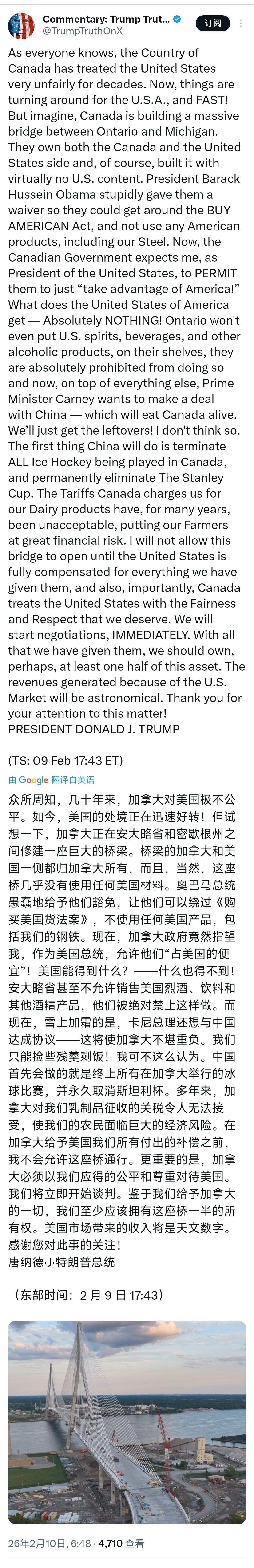 美国总统特朗普威胁不让连接美国密歇根州和加拿大安大略省的一座新大桥通车。 北京时间2月10日,美国总统特朗普在社交平台发文,一番话直接把美加关系推上风口浪尖。他公开放话威胁,绝不会让连接美国密歇根州和加拿大安大略省的那座新建大桥顺利通车。 特朗普的发文语气带着明显的不满,字里行间全是对加拿大的抱怨。他直言不讳地表示,几十年来加拿大对美国一直极不公平,如今美国的处境正在快速好转,绝不会再任由加拿大“占便宜”。 他特意提到了那座正在修建的巨大跨国大桥,语气里满是指责。特朗普强调,这座连接安大略省和密歇根州的大桥,不管是加拿大一侧还是美国一侧的产权,竟然全都归加拿大所有。 更让他不满的是,这座大桥的修建过程中,几乎没有使用任何美国生产的材料。他还点名批评前总统奥巴马,称奥巴马当年愚蠢地给予加拿大相关豁免,才让对方有了可乘之机。 特朗普越说越激动,他质问加拿大政府,竟然还指望自己作为美国总统,默许他们这样继续占美国的便宜。他接连反问,美国能从这件事里得到什么,答案却是一无所有。 除了大桥的问题,特朗普还列举了其他不满,以此佐证加拿大对美国的“不公”。他提到,安大略省至今都不允许销售美国烈酒,这无疑是在变相打压美国相关产业。 紧接着,他又吐槽卡尼总理的相关计划,称对方想和中国达成协议的举动,更是雪上加霜。特朗普妄言,这样的协议会让加拿大不堪重负,而美国最后只能捡些残羹剩饭。 他还给出了荒唐的猜测,称中国一旦和加拿大达成协议,首先会做的就是终止所有在加拿大举行的冰球比赛,言语间满是不合理的担忧和指责。 吐槽完所有不满后,特朗普再次亮明自己的态度,语气十分强硬。他明确表示,在加拿大给予美国所有应得的补偿之前,自己绝对不会允许这座大桥通行。 他还提出了自己的诉求,称鉴于美国这些年给予加拿大的一切帮助和支持,美国至少应该拥有这座大桥一半的所有权。他甚至直言,这座大桥带来的美国市场相关收入,将会是天文数字。 可能很多网友不知道,这座被特朗普反复提及的大桥,名叫戈迪·豪国际大桥,2018年就已启动建设,原计划今年晚些时候正式通车,全程由加拿大联邦政府全额出资修建。 特朗普的这番表态,看似是为美国争取利益,实则暗藏私心,更是他一贯的贸易强硬风格的体现。他向来擅长用此类强硬威胁,向其他国家施压,以此谋求所谓的“公平”。 事实上,美加两国一直存在诸多贸易分歧,此前就因关税、农产品出口等问题多次产生摩擦,这次的大桥风波,无疑会让两国本就紧张的关系雪上加霜。 目前,加拿大方面尚未对特朗普的威胁作出明确回应,但不难预料,双方后续大概率会围绕大桥的产权、补偿等问题展开谈判。特朗普的强硬诉求,能否得到加拿大的认可,还是个未知数。 值得一提的是,美国密歇根州的部分官员已经公开谴责特朗普的举动,称阻止大桥通车会产生严重后果,本质上是在用贸易战惩罚当地民众,损害的还是美国自身的利益。