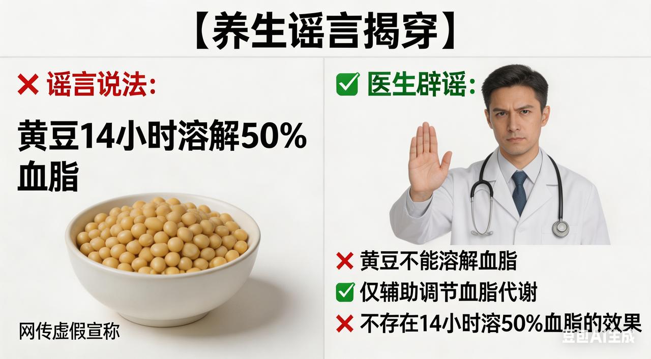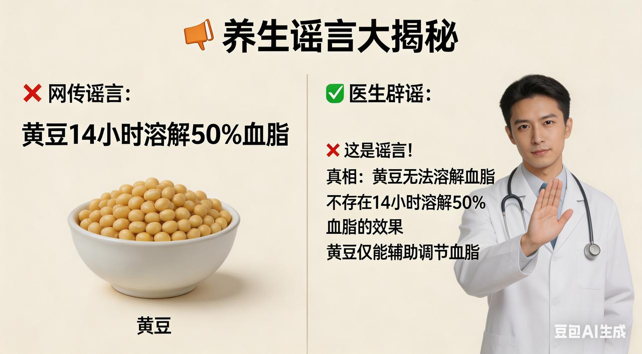黄豆真能 14 小时溶解 50% 血脂?医生揭穿养生谣言真相 黄豆14小时溶50%血脂:科学真相还是网络臆断? 近期,“黄豆能在14小时内溶解50%的血脂”这一论断在网络空间中广泛流传,犹如一颗投入舆论湖面的石子,激起层层涟漪,引发了社会各界的广泛关注。尤其对于众多饱受高血脂困扰的患者而言,这一说法宛如黑暗中的一丝曙光,让他们似乎看到了不依赖药物就能轻松降低血脂的希望。然而,这一看似诱人的论断,究竟是经过严谨科学验证的发现,还是以讹传讹、缺乏依据的网络谣言呢? 从现有的科学研究脉络来审视,确实存在与之相关的实验探索。在特定的模拟人体消化环境的实验设置下,科研人员发现黄豆中所含的卵磷脂等活性物质,在14小时的时间跨度内,能够使试管中的脂质沉积物减少达50%[1][2][3]。但我们必须以科学、严谨的态度深入剖析这一实验结果。其一,实验所营造的环境是“模拟”的,与真实的人体内部环境存在着本质的差异。人体是一个高度复杂且精密的生理系统,拥有独特而完善的生理机制和代谢过程,各个器官和系统之间相互协作、相互影响,形成了一个错综复杂的网络。而实验室中的模拟环境,无论多么接近真实,都无法完全复刻人体内部的种种细微变化和动态平衡。其二,实验所针对的对象是“脂质沉积物”,而人体内的血脂,是指血液中的胆固醇、甘油三酯等脂类物质。这些脂类物质在人体内并非简单地漂浮在血液中,而是被巧妙地“打包”在脂蛋白里进行运输和代谢。脂蛋白就像是一艘艘运输脂类物质的“货船”,在血液中按照特定的路线和规律航行,完成脂类的吸收、运输和利用等生理过程。因此,不存在一种食物能够像溶解实验中的脂质沉积物那样,瞬间溶解人体内的血脂[3][6]。 截至目前,在全球范围内权威的医学期刊和正规的临床试验数据库中,均没有任何一项正规的临床试验能够证实,食用黄豆可以在14小时内溶解人体50%的血脂[3][6]。不过,我们也不能完全否定黄豆在血脂调节方面的积极作用。众多严谨的科学研究表明,适量食用黄豆对血脂调节确实具有一定的益处。黄豆富含植物蛋白、大豆异黄酮、膳食纤维等多种营养成分,这些成分就像是一群勤劳的“健康卫士”,在人体内发挥着各自独特的作用。植物蛋白能够为人体提供必要的营养支持,同时减少胆固醇的吸收;大豆异黄酮具有类似雌激素的作用,能够调节脂代谢过程,降低血液中胆固醇的含量;膳食纤维则可以促进肠道蠕动,增加粪便的排出量,从而减少胆固醇在肠道内的吸收[4][5]。美国心脏协会(AHA)作为全球心血管领域最具权威性的专业组织之一,也曾发布官方声明指出,每日摄入25克大豆蛋白,有助于减少总胆固醇和低密度脂蛋白胆固醇(LDL胆固醇,俗称“坏胆固醇”)水平,对维护心血管健康具有积极的意义[4]。 综上所述,“黄豆14小时溶解50%血脂”的说法是对科学研究的严重夸大和曲解,甚至可以说是一种误导公众的虚假信息,更像是某些别有用心之人为了吸引眼球、博取流量而精心炮制的“健康爽文标题”[3]。高血脂患者切不可轻信此类缺乏科学依据的说法,将降血脂的希望完全寄托在吃黄豆这一单一措施上。若血脂出现异常,应当及时咨询专业的医生,遵循医生的建议,通过合理饮食、适量运动以及必要时进行药物治疗等综合方式来控制血脂。只有这样,我们才能真正守护好我们的心血管健康,远离高血脂带来的各种健康风险。