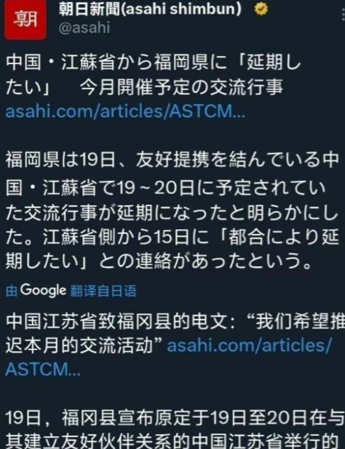 中日之间已经没有“友好”关系了?日本福冈县宣布,中国江苏省向日本福冈县通报,由于不可预见的原因,推迟原定于11月19日至11月20在江苏省举办的交流活动。 说白了,这次江苏推迟和日本福冈的交流活动,根本不是什么“不可预见的原因”,就是双方那层虚伪的“友好”窗户纸,又被戳破了一个窟窿,大家都心照不宣,却还要装模作样找个借口罢了。 可能有人会说,不就是一场交流活动推迟吗,至于这么过度解读?但其实只要稍微关注一下最近的动态就知道,这根本不是个例。 最近这段时间,中日之间的各类交流活动,简直就跟闹着玩一样,取消的取消,推迟的推迟,一场接着一场,从来没断过。 就说江苏和福冈这场,很多人不知道,江苏和福冈其实是友好省县,平时往来不算少,这次推迟的交流活动,原本是江苏在今年9月份就发出了邀请,除了福冈县,日本的爱知县和石川县也收到了邀请。 福冈县甚至都已经安排好了政府职员,准备前往江苏泰州市,参加这场以创新和医疗健康为主题的交流活动,结果临到跟前,还是被推迟了,至于后续什么时候能重新举办,目前也没有任何明确的消息。 除了这场,江苏徐州原本计划派代表团前往日本爱知县半田市访问,要知道徐州和半田市早在1993年就结为了友好城市,这次访问也算是常规的友好往来。 徐州方面原本安排了6名相关人士,计划在11月18日礼节性拜访半田市市长久世孝宏,还会参观当地的农业设施等。 但半田市在11月15日就收到了徐州方面的邮件通知,说访问要取消,邮件里只提了“有重要公务”,没说其他多余的话,新的访问日期也没确定。 不光是中方取消访问,南昌也推迟了日本高松市访问团的行程,高松市原本计划派遣官方访问团前往江西南昌,开展相关交流活动。 但南昌方面主动联络高松市,说明按照目前两国的情况,就算交流活动如期举行,也没办法取得充分的成效,所以只能推迟,具体推迟到什么时候,也没有给出明确答复。 更让人关注的是,就连在广岛举办的日中友好纪念活动,也被紧急叫停了。这场活动原本定在11月21日举行,初衷是为了拉近中日两国民众的距离,筹备了不短的时间。 参与方涵盖了地方政府、友好协会和文化团体,原本还计划通过文化演出、互动交流等形式,增进彼此的了解。 但在11月17日,中国驻大阪总领事馆正式通知日方相关人士,决定叫停这场活动,给出的原因是担心安保问题。 据悉,叫停这场活动的背后,是因为中国驻大阪总领事薛剑此前在社交媒体上批评了日本首相高市早苗的涉华错误言论,这引发了日本自民党和极右翼势力的不满。 甚至有人在网上发布带有威胁性质的言论,点名针对薛剑总领事,语言激烈,还出现了人身威胁的字眼,出于对参与人员安全的考虑,这场原本承载着“友好”意义的活动,最终只能仓促叫停。 除此之外,还有不少中日交流活动受到影响,比如原定于11月下旬在北京举办的“东京-北京论坛”宣布延期,日本贸易振兴机构参与的24场在华活动被取消。 日本山口县下关市市长前田晋太郎等人,原定11月18日到20日赴中国出差,计划出席在苏州举行的下关港苏州研讨会,最终也临时取消了行程。 这些接二连三的取消和推迟,不是偶然,也不是所谓的“不可预见”,更不是某一方单方面的决定,而是双方之间的氛围,早就不适合再硬着头皮演“友好”了。 一场场交流活动的变动,就像是一个个信号,无声地传递着当下中日关系的状态,没有激烈的争执,没有公开的指责,却用最实际的行动,打破了那层虚伪的“友好”假象。 其实不管是地方层面的交流,还是民间的互动,想要顺利开展,前提都是双方彼此尊重、互相信任,一旦这份信任不存在了,再多的“友好”口号,再多的筹备工作,最终也只能沦为泡影。 最近这些交流活动的变动,不过是这种状态的真实体现而已,大家不用过度解读,也不用刻意回避,这就是当下最真实的情况。