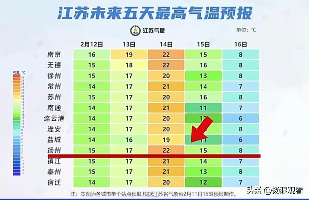 扬州人紧急注意!除夕断崖式大降温⚠️ 扬州天气直接坐过山车🎢 这波温差真的吓死人! 扬州气象最新播报👇 今晨最低 0℃~-1℃ 今天最高 15℃~16℃ 2月14日 直冲22℃ 一秒入春的错觉来了! 结果… 2月16日 除夕当天 最高温直接暴跌到 7℃ 一夜打回寒冬模式❄️ 22℃→7℃ 断崖式降温 扬州的天气比变脸还快! 准备过年穿新衣的朋友 厚衣服千万别收! 保暖最重要,别冻感冒啦~