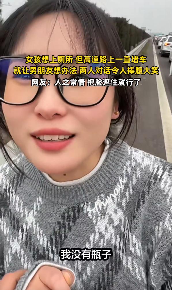 这下完了, 这下全网都认识这个漂亮的女孩子了! 她在高速堵车时突然内急,没想到她居然想到用瓶子解决。 节假日的高速公路,早已成为无数人出行途中绕不开的场景,车流密集时长时间停滞,是再常见不过的状况。 这样的拥堵不只是耽误行程,更会催生许多现实难题,其中最让人难以启齿,却又无法回避的,就是出行途中的生理需求。 很多人都有过类似经历,车辆堵在半路,前后看不到尽头,距离最近的服务区还有很远,内急的困扰瞬间袭来,让人陷入进退两难的境地。 在这样的大背景下,男女面临的处境有着明显的差别。 男性应对这类突发状况,往往能找到相对简便的解决方式,即便条件简陋,也能勉强应对。 可对于女性而言,路边没有任何遮挡,周围全是行驶或停滞的车辆,到处都是视线,想要就地解决,要承受极大的心理压力和尴尬感,这不是矫情,而是现实条件带来的客观不便。 以往不少女性在高速堵车内急时,只能硬着头皮在路边隐蔽处简单处理,全程小心翼翼,生怕被人看到,这种窘迫,只有经历过的人才会懂。 有一对情侣在驾车返程途中,就遭遇了这样的棘手问题。 当时高速路段出现严重拥堵,车流长时间纹丝不动,女子突然感到内急,四处张望后发现,附近既没有临时厕所,也没有即将到达的服务区,焦急的情绪一下子涌了上来。 她实在没有办法,只能让同行的男朋友帮忙想想解决的办法,希望能找到一个既能缓解窘境,又能保留隐私的方式。 可让她没想到的是,高速路上一直堵车,她让男朋友想个办法,男朋友却突然跟她说:“你在路边解决。” 这样的提议,在女子看来完全无法接受。 她清楚地知道,高速路边人来人往,没有任何可以遮挡的物体,露天解决根本不现实,不仅会让自己陷入极度尴尬的境地,也不符合基本的行为体面。 她当即拒绝了这个想法,不是刻意挑剔,而是这个提议完全没有考虑到女性的生理特点和心理感受。 男友却觉得自己是无计可施才提出这样的建议,看着女友难受的样子,他也想不出更好的对策,一时间只觉得委屈。 原本轻松的出行氛围,因为这件小事被彻底打破。 两人开始出现争执,女子抱怨提议不体谅人,男友则觉得自己好心没被理解,一点小事被放大,双方都带着情绪。 周围同样被堵在路上的车主,大多也面临着相似的问题,不少人开窗透气时,听到了两人的争执,也纷纷心生感慨。 大家都明白,堵车内急不是小事,那种憋闷又无助的感觉,足以让人情绪崩溃,只是男性的应对难度远低于女性,才会出现这样的认知偏差。 在等待车流挪动的过程中,女子也尝试过寻找其他出路。 她想过翻越高速护栏,到下方相对隐蔽的地方解决,可又担心车辆突然启动,自己来不及返回,反而引发安全问题。 也有人在类似情况下,会选择在车内用瓶子、塑料袋等物品应急,这种方式虽然简陋,却能最大程度保护隐私,也打破了很多人固有的认知,让女性在面对这类突发状况时,多了一种可行的选择。 车流依旧没有明显挪动,焦虑感在人群中不断蔓延。 女子的好心情被彻底打乱,原本期待的返程之旅,因为这场突发的尴尬陷入别扭。 周围的路人没有嘲笑,也没有刻意围观,大家都心怀理解,毕竟人有三急本就是人之常情,出门在外遇到这样的意外,谁都无法完全避免。 很多有经验的网友都曾分享过,节假日长途出行,一定要提前备好塑料袋、小盆等应急物品,就是为了应对高速堵车内急的情况,这不是多此一举,而是实实在在的出行经验。 今天的分享到这里就结束了,大家对此事有何看法,欢迎在评论区留言和讨论,感兴趣的可以点击头像加关注,我将每日更新优质内容,我们下期见。