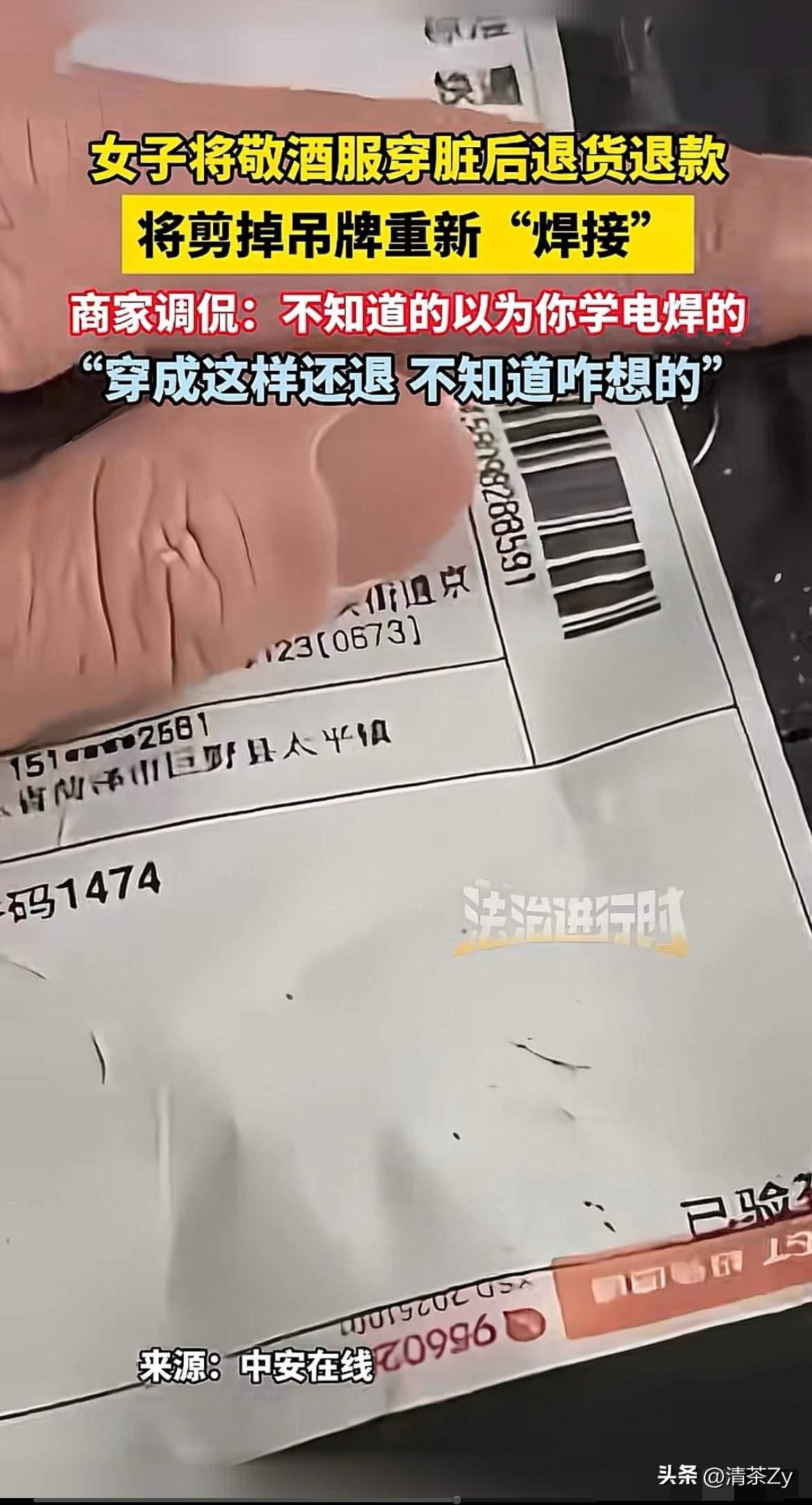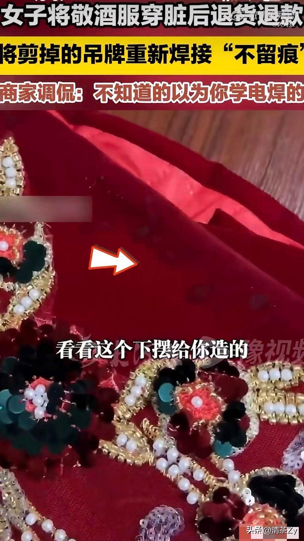 鄙视这样的人!山东一女子在网上购买了一件敬酒礼服,婚礼结束以后女子竟然把沾满污渍的脏衣服给商家退了回去! 商家收到退货包裹后,打开一看吃了一惊!吊牌剪断后又给焊了回去,导致接口处鼓起一个黄豆大小的包! 不光接口是焊接的,就连礼服的下摆也非常脏甚至于还沾着食物!还有几处有明显的污渍!很明显这是婚结完了衣服也不要了!就是为了白穿这一个婚礼! 把商家给气的说:难道这个新娘大学学的是电焊专业吗?把吊牌焊接得这么完美! 商家说这件衣服肯定是废了,不可能再二次销售了!气的商家把买家的地址也展示了出来显示山东某镇! 太没必要这样做了!一辈子也可能就结一次婚!一件礼服能花费多少钱?如果连一件礼服都舍不得买的话,这婚结不结还有什么必要!