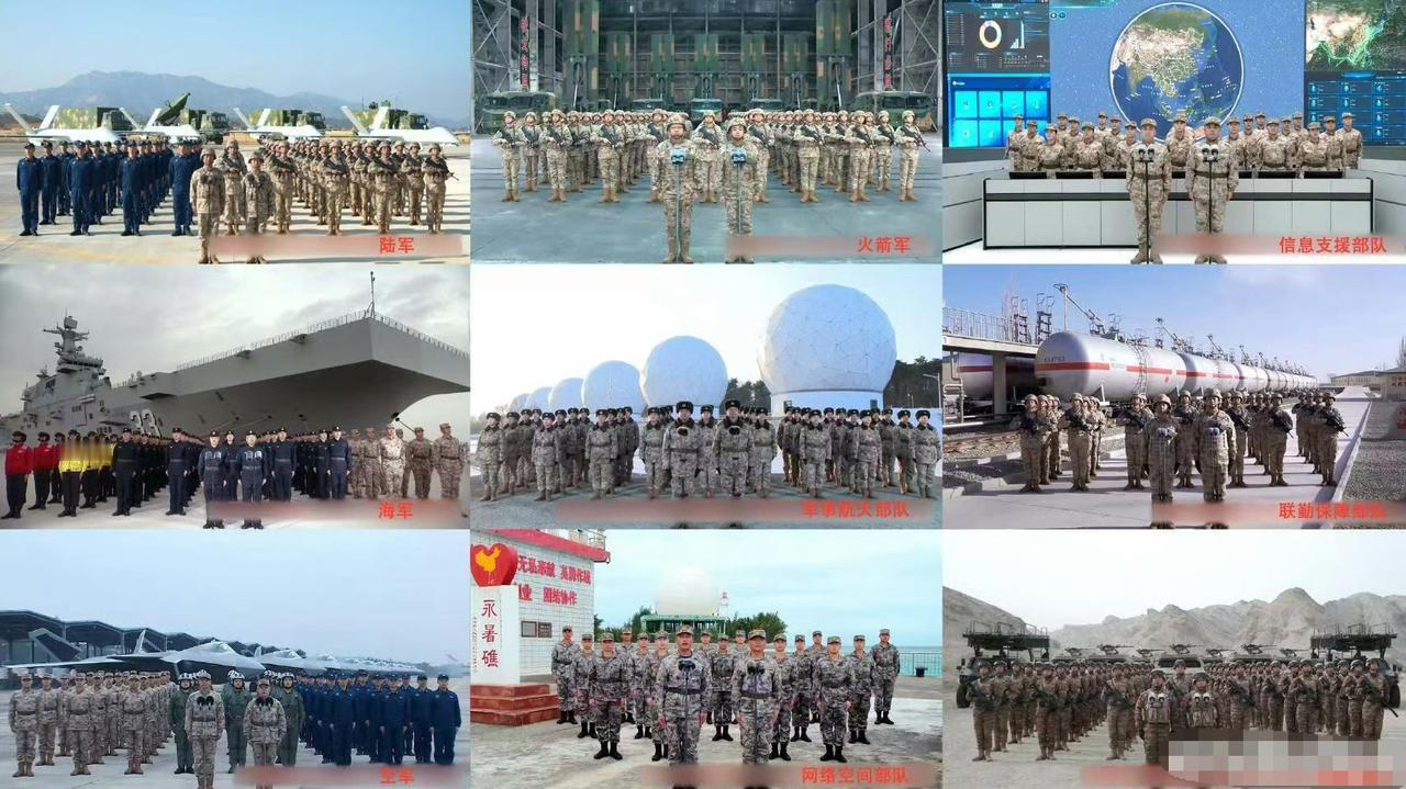 这只是拜年,大家别多想。再说一遍,只是拜年。 哈哈哈哈! 空军的背景,是歼-20A,不多,只10架。 海军的背景,是075型两栖攻击舰安徽舰,不是福建舰航母。 更有两个有意思的细节: 一个是,信息支援部队的背景,没有打码。 一个是,网络空间部队的背景,是在永暑岛。 最后再说一遍,只是拜年。