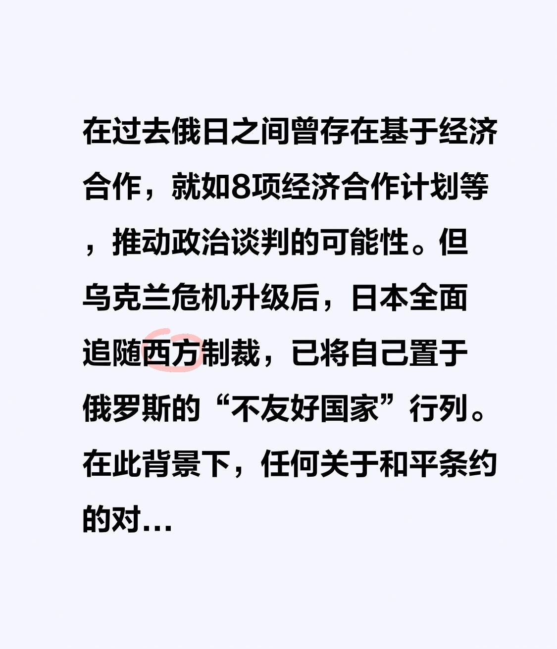 在过去俄日之间曾存在基于经济合作,就如8项经济合作计划等,推动政治谈判的可能性。但乌克兰危机升级后,日本全面追随西方制裁,已将自己置于俄罗斯的“不友好国家”行列。在此背景下,任何关于和平条约的对话都失去了最起码的互信基础。日本的对俄矛盾立场,与其对华政策同出一辙——即在安全上全面倒向美国并强化对抗,同时又希望在经济和外交上保留一定空间。这种试图在两大阵营间“骑墙”的策略,正同时遭到中俄的联手反击。