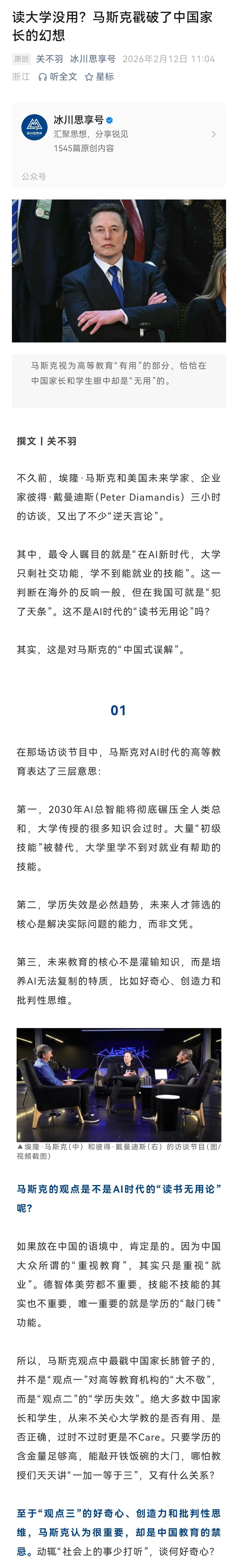 家长关注孩子的考试分数,远过关注他们的身心健康、兴趣、好奇心、创造力培养,是因为他们相信一个等式,高分=好学校=好工作。当下的焦虑是,他们不清楚哪些是“好专业”,如果明确哪些专业一定好就业,他们就相信孩子进了好学校、好专业,就一定(至少大概率)有好工作。 而在AI时代,家长们会发现,所谓的好大学、好专业等于好工作的等式将被打破。因为大学、专业都面临巨大挑战与不确定性,就是在大学毕业时找到一份所谓的好工作,可能几年之后工作就没了。真正能应对未来挑战的,恰恰恰也是他们不重视培养的,这就是孩子的兴趣、好奇心、创造力。